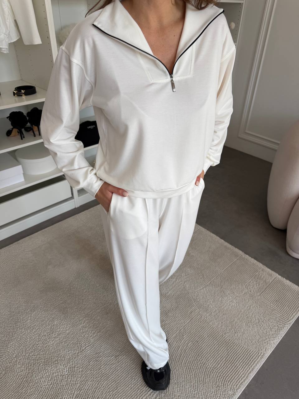 Стильний та комфортний костюм — ідеальний вибір для щоденних образів. Комплект складається зі світшота з високим коміром на блискавці та вільних штанів із м’якою посадкою. Лаконічний дизайн робить модель універсальною — підходить як для прогулянок, так і для подорожей чи домашнього відпочинку.