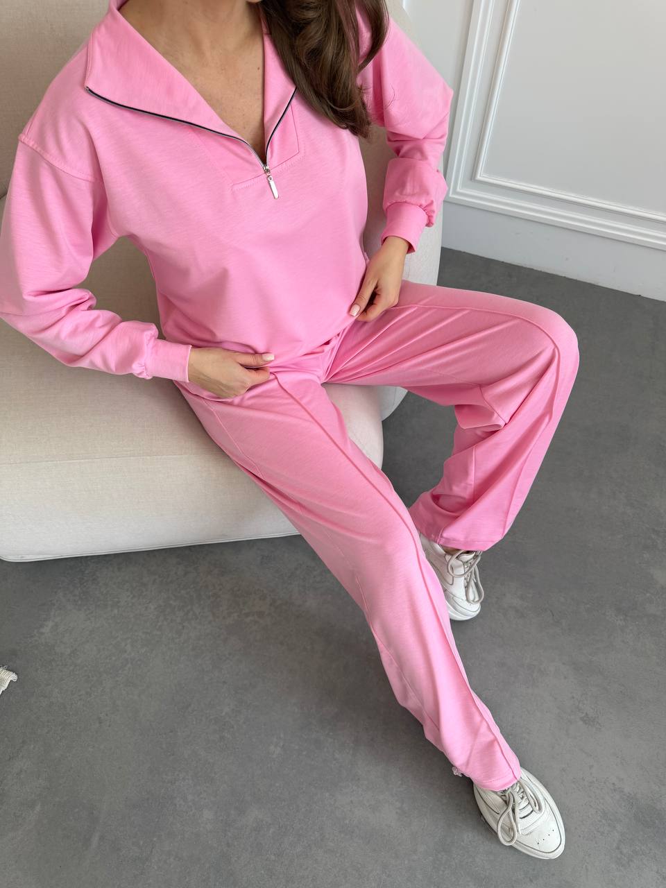 Стильний та комфортний костюм — ідеальний вибір для щоденних образів. Комплект складається зі світшота з високим коміром на блискавці та вільних штанів із м’якою посадкою. Лаконічний дизайн робить модель універсальною — підходить як для прогулянок, так і для подорожей чи домашнього відпочинку.