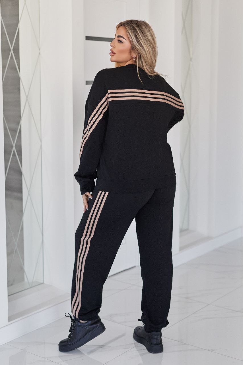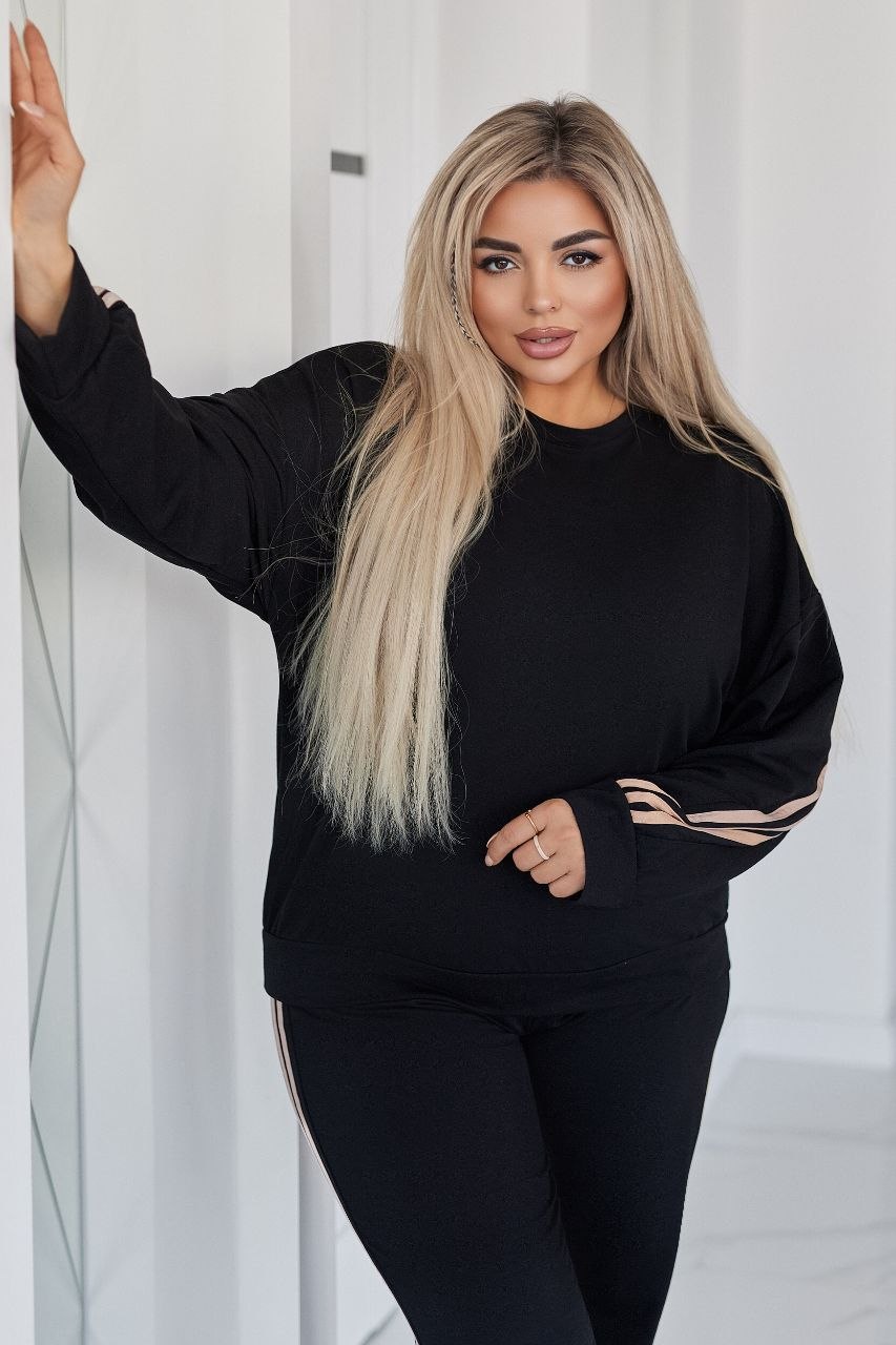 Стильний прогулянковий костюм, штани на високій посадці, кругова резинка, манжети. Кофтинка вільного крою, декорована стильними лампасами. Костюм виготовлений с двунитки, гарна розтяжність.