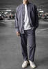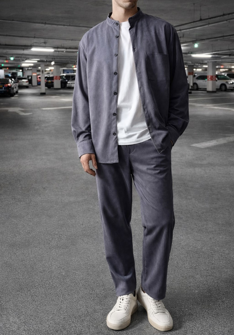 Модель виконана з вельвету: тканина щільна, приємна на дотик і виглядає дорого, при цьому не тягнеться. Сорочка прямого крою на ґудзиках із коміром-стійкою додає образу елегантності, а штани вільного силуету забезпечують зручність у щоденному носінні.