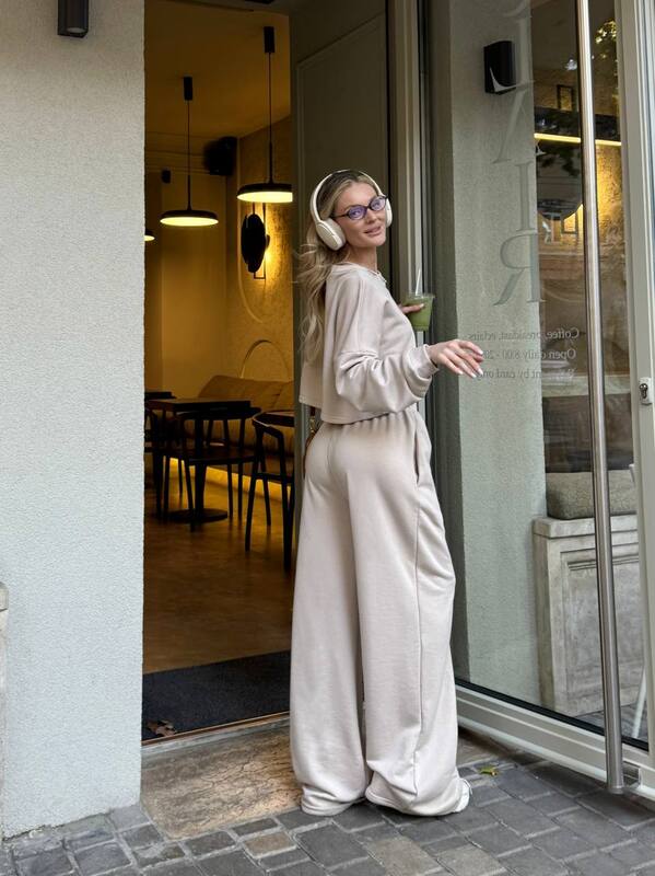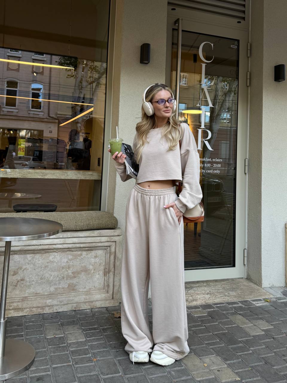 Кроп-світшот із спущеним плечем та широкі штани на резинці — ідеальний дует для прогулянки містом, кави з подругою чи просто chill-дня вдома. Виглядай модно, навіть коли максимально розслаблена