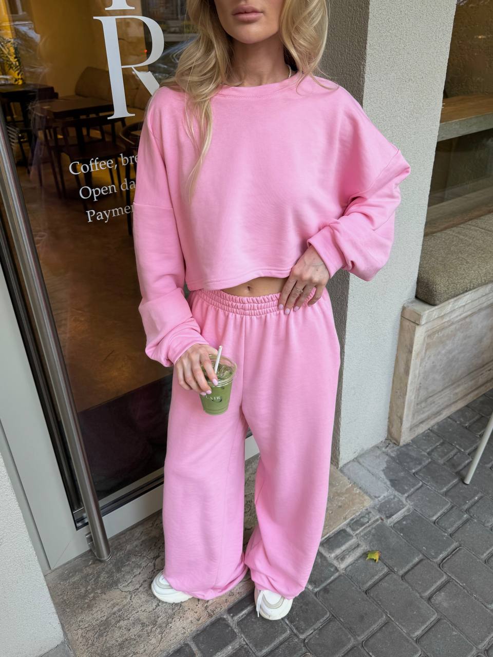 Кроп-світшот із спущеним плечем та широкі штани на резинці — ідеальний дует для прогулянки містом, кави з подругою чи просто chill-дня вдома. Виглядай модно, навіть коли максимально розслаблена