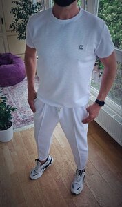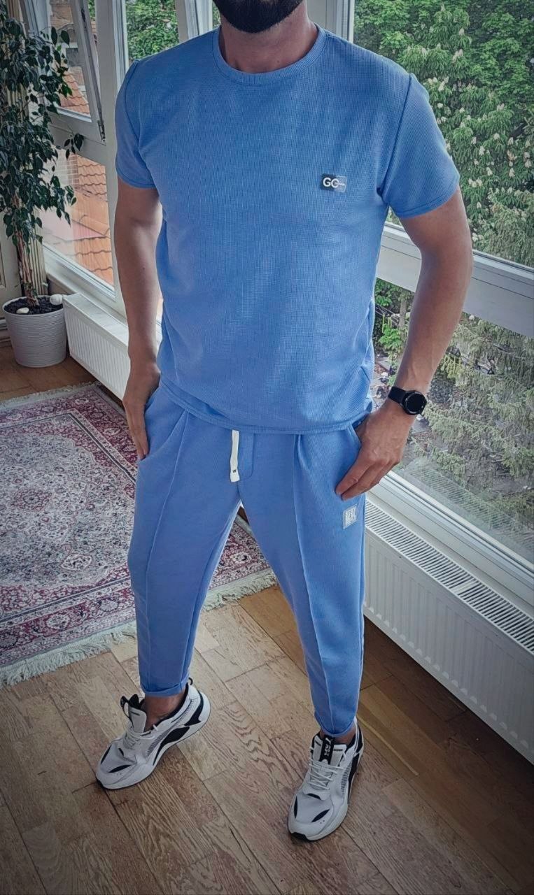 Футболка з фактурною текстурою,декорована силіконовою нашивкою на груднях.Штани з еластичним поясом,шнурком,бічними кишенями та силіконовою нашивкою.