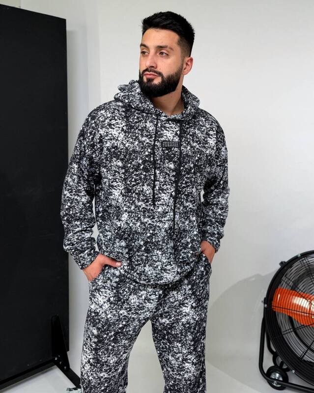 Зручний костюм:худі з капюшоном і кишенею-кенгуру,з декоративним елементом на грудях+штани на резинці зі шнурком-фіксатором і кишенями,з манжетами внизу.