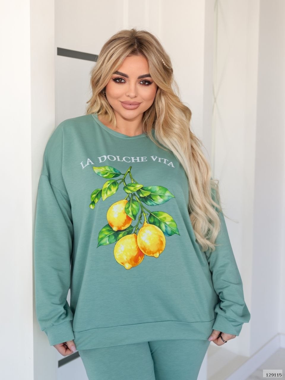 Стильний, комфортний костюм в трендових кольорах, виготовлений з двунитки гарної розтяжності. Подовжений світшот вільного крою з ефектним лимонним принтом, штани-лосини 7/8, висока посадка, кругова резинка. Ідеальний варіант на кожен день з кедами та кросівками.