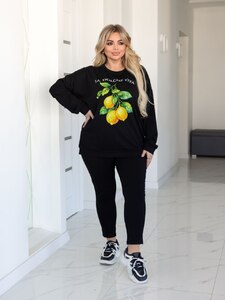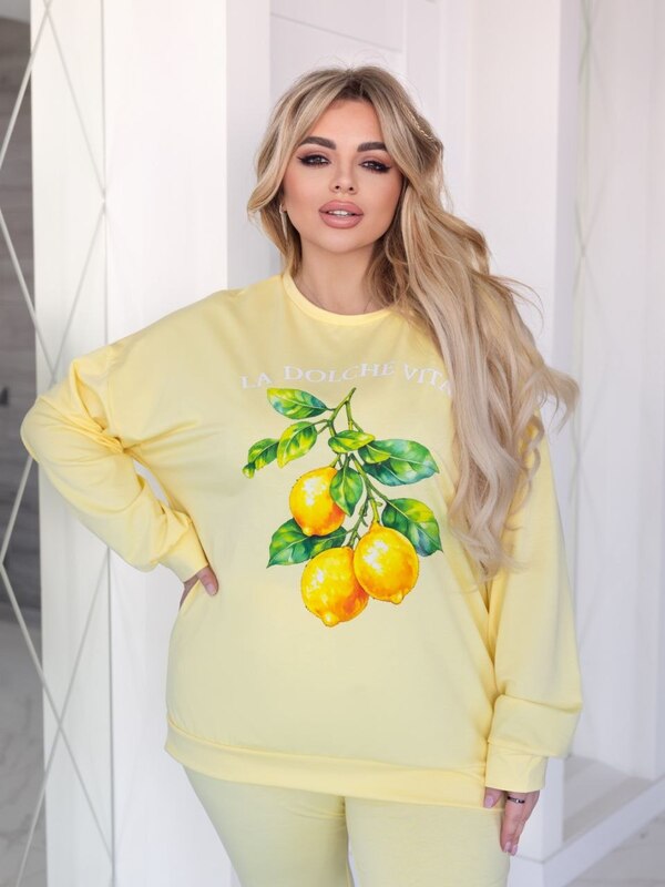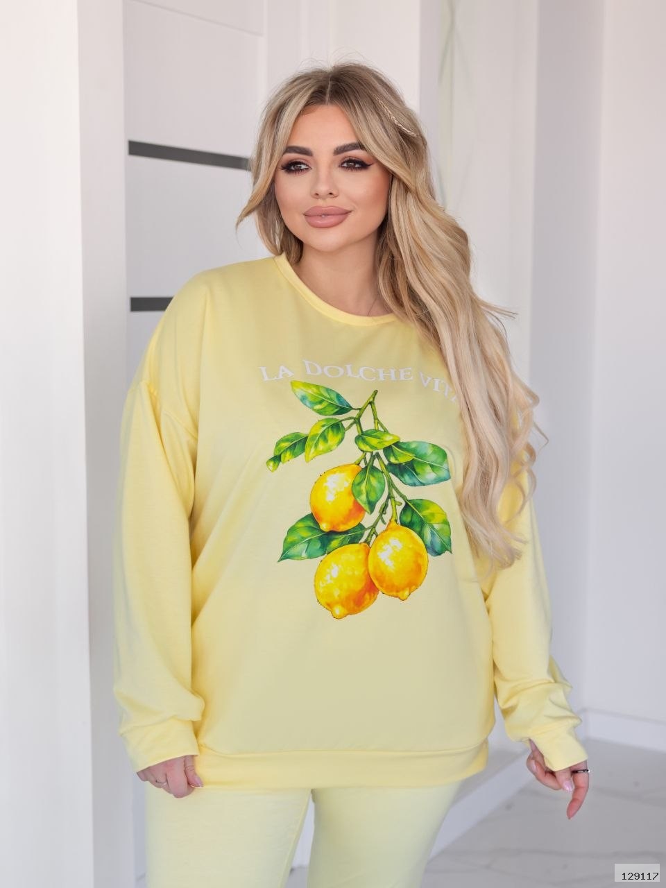 Стильний, комфортний костюм в трендових кольорах, виготовлений з двунитки гарної розтяжності. Подовжений світшот вільного крою з ефектним лимонним принтом, штани-лосини 7/8, висока посадка, кругова резинка. Ідеальний варіант на кожен день з кедами та кросівками.