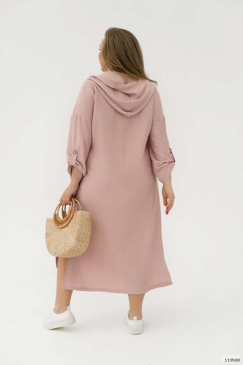 Сучасна та стильна сукня спортивного крою довжини максі зі спущеними плечима. Сукня вільного крою в стилі оверсайз з довгим рукавом, який доповнений не функціональною шлейкою на ґудзику. Ми зробили не великий виріз горловини V-форми, який переходить в капюшон . Дизайнери додали велику функціональну кишеню на передню частину сукні. Сукня подовжена по спинці, а по боковій частині подолу ми зробили розрізи які додають повітряності образу.