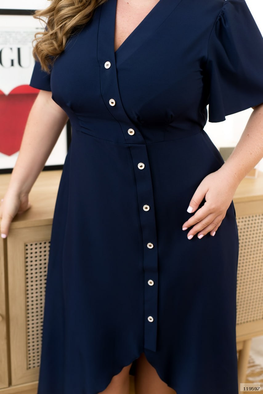 Ця однотонна сукня стане універсальною й улюбленою річчю в гардеробі. Діагональні декоративні гудзики, які проходять від горловини через відрізну лінію талії та до коліна- це головна особливість сукні, що створює акцентну лінію. Рукава-крильця надають повітряності образу. Поділ по передній частині сукні вкорочений. Цей виріб привертає увагу своїми цікавими деталями та при цьому має лаконічний дизайн, який підкреслить вашу неповторну красу.