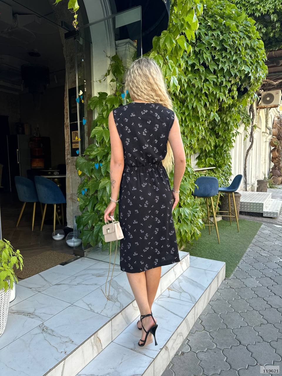 Це плаття без рукавів має приталений силует із м’якою резинкою на талії, що підкреслює жіночні форми. Довжина до колін робить його зручним для щоденного носіння, а лаконічний виріз з невеликим розрізом додає вишуканих ноток.
