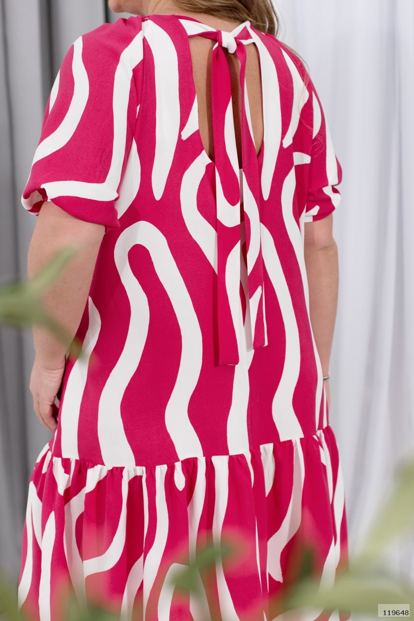 Ця сукня — про легкість, затишок і трішки романтики. Вільний фасон ідеально сідає на будь-яку фігуру, даруючи максимальний комфорт. Напівкругла горловина м’яко зібрана на гумці — виглядає ніжно та делікатно. Короткі рукави у стилі реглан із легкими збірками на резинках додають силуету об’єм і невимушеність. Родзинка моделі — круглий виріз на спинці, зав’язаний стрічкою в тон, що додає образу жіночності та легкої інтриги. Вздовж усієї спинки йде акуратний шов, який гарно оформлює силует і підкреслює вертикальну лінію. А поділ, оздоблений воланом, створює відчуття руху, легкості та літнього настрою