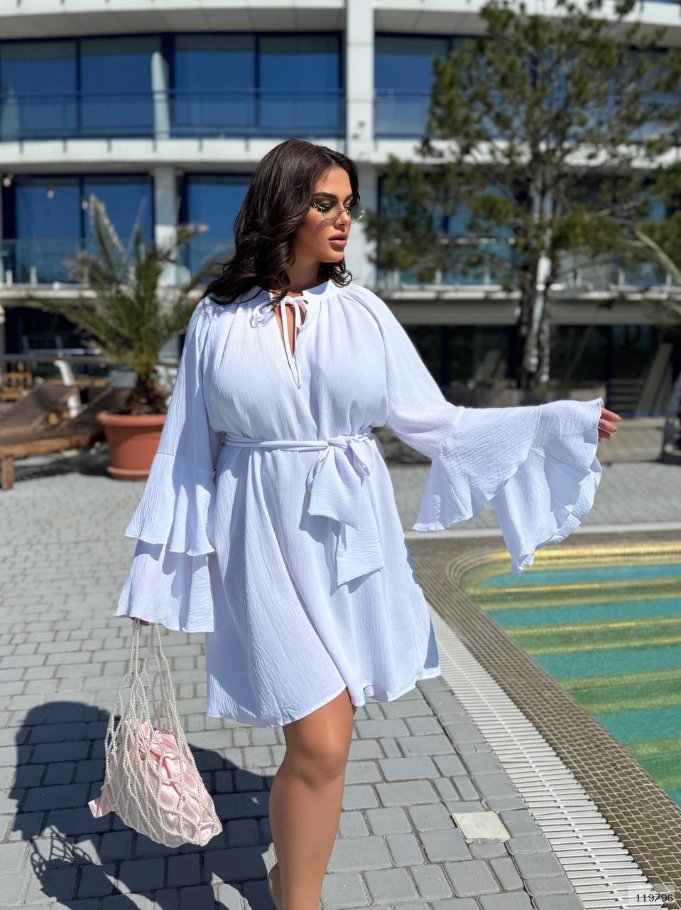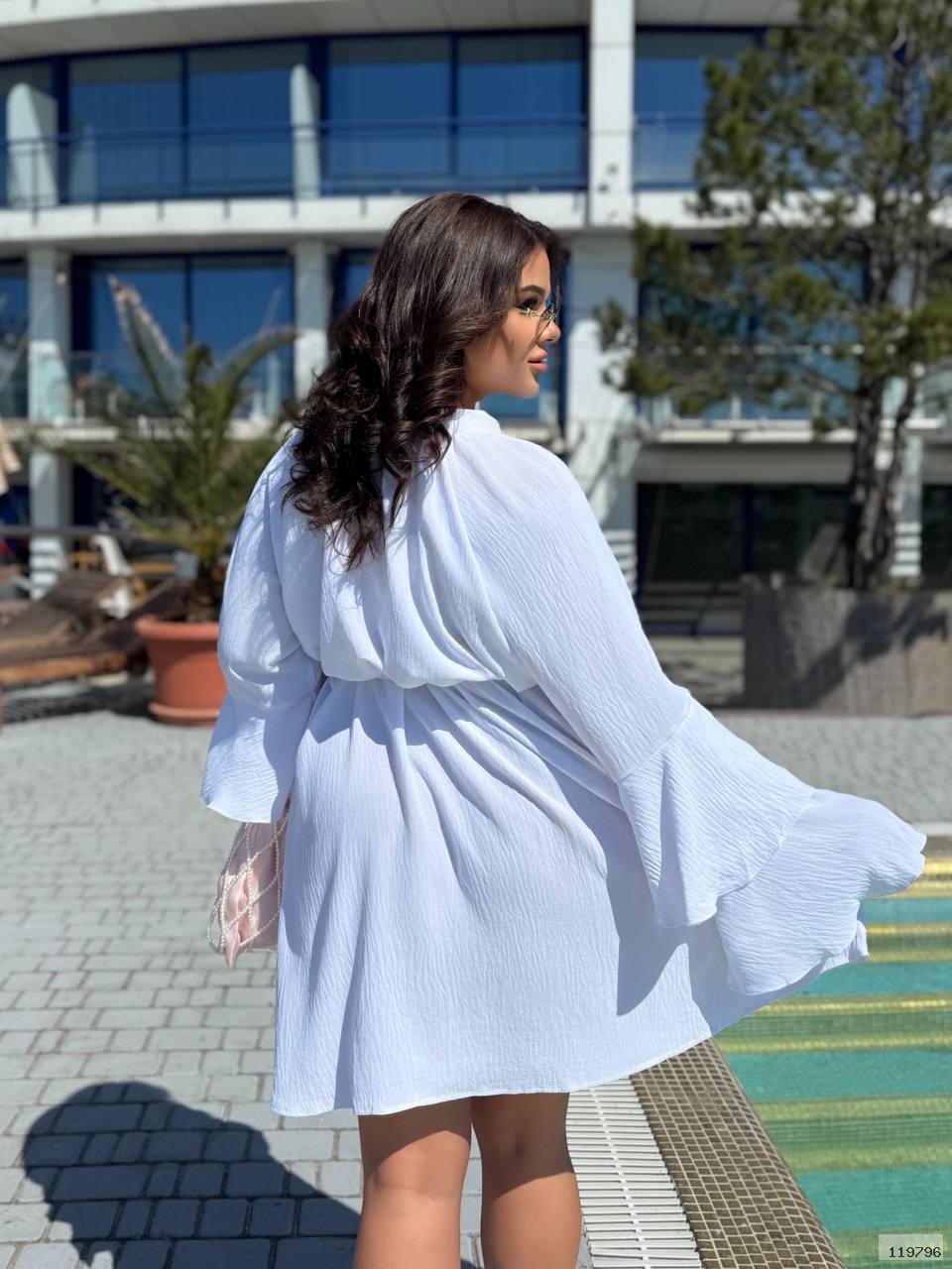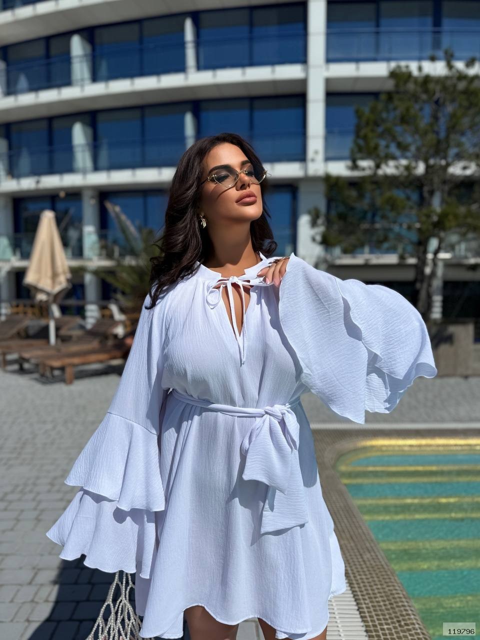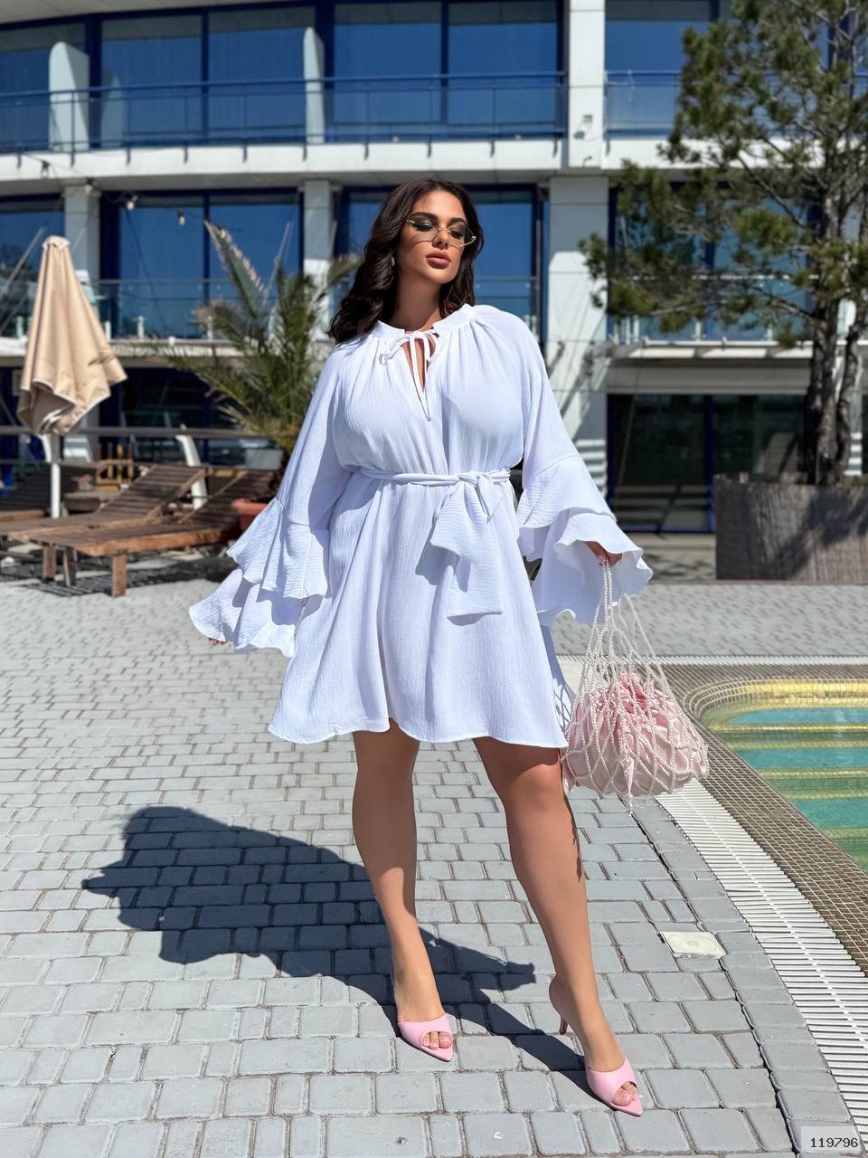 Легка сукня oversize з рукавами-воланами та поясом на талії