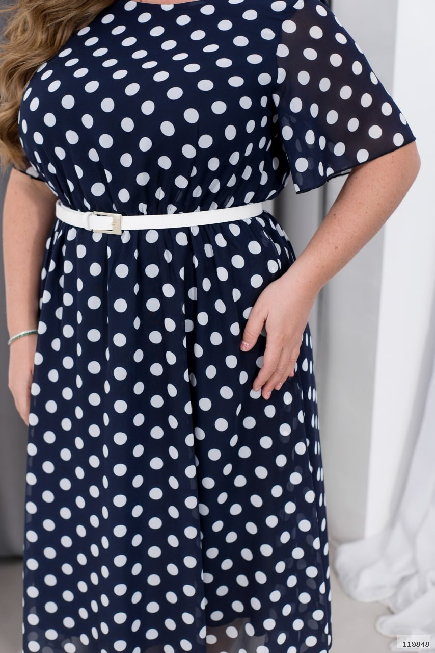 Ця повітряна сукня з легкого шифону створює враження легкості та грації. Вона має півкруглий виріз горловини та відрізну лінію талії, яка спадає плісованими оборками, надаючи образу ніжності. Сукня складається з двох шарів тканини: верхній шар — напівпрозорий шифон, а нижній — м’який та приємний на дотик, що дарує комфорт протягом усього дня. Рукава короткі та вільні, що забезпечує ще більшу повітряність і зручність. Для додаткового акценту на талії можна використовувати пояс, який входить в комплект.
