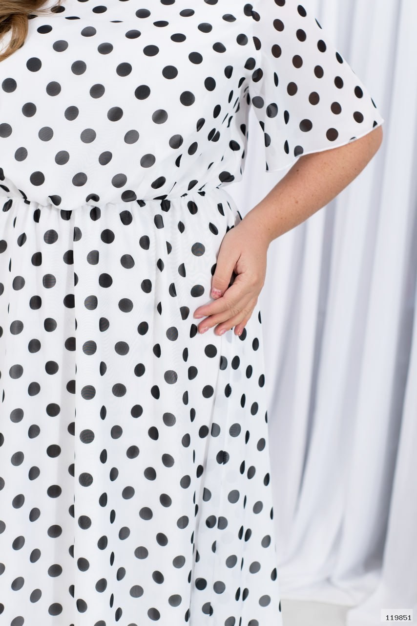 Ця повітряна сукня з легкого шифону створює враження легкості та грації. Вона має півкруглий виріз горловини та відрізну лінію талії, яка спадає плісованими оборками, надаючи образу ніжності. Сукня складається з двох шарів тканини: верхній шар — напівпрозорий шифон, а нижній — м’який та приємний на дотик, що дарує комфорт протягом усього дня. Рукава короткі та вільні, що забезпечує ще більшу повітряність і зручність. Для додаткового акценту на талії можна використовувати пояс, який входить в комплект.