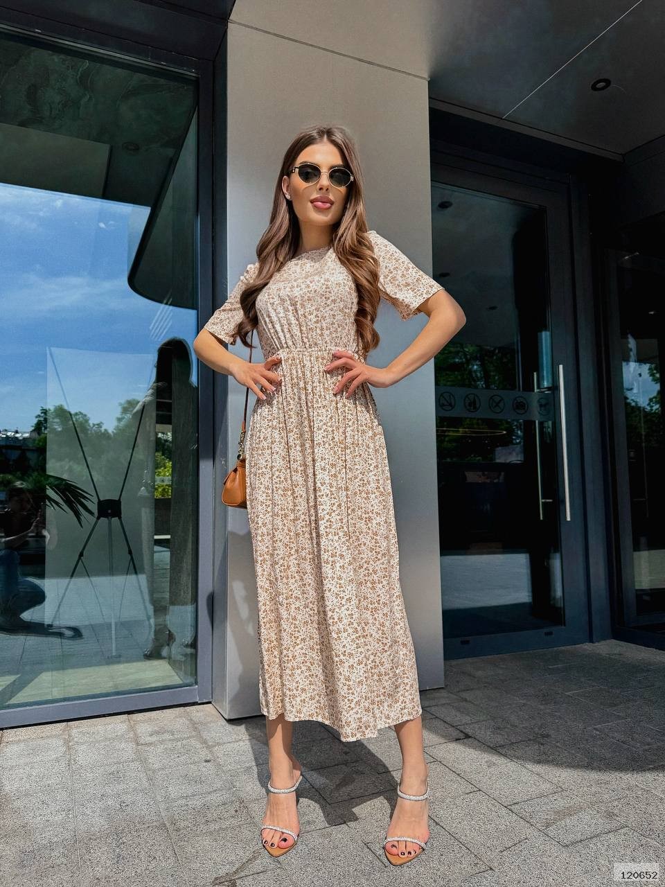 Це легке міді-плаття з короткими рукавами та дрібним квітковим візерунком. Модель має приталений крій у верхній частині й вільну спідницю, що створює жіночний і комфортний силует. Ідеальний варіант для теплої пори року.