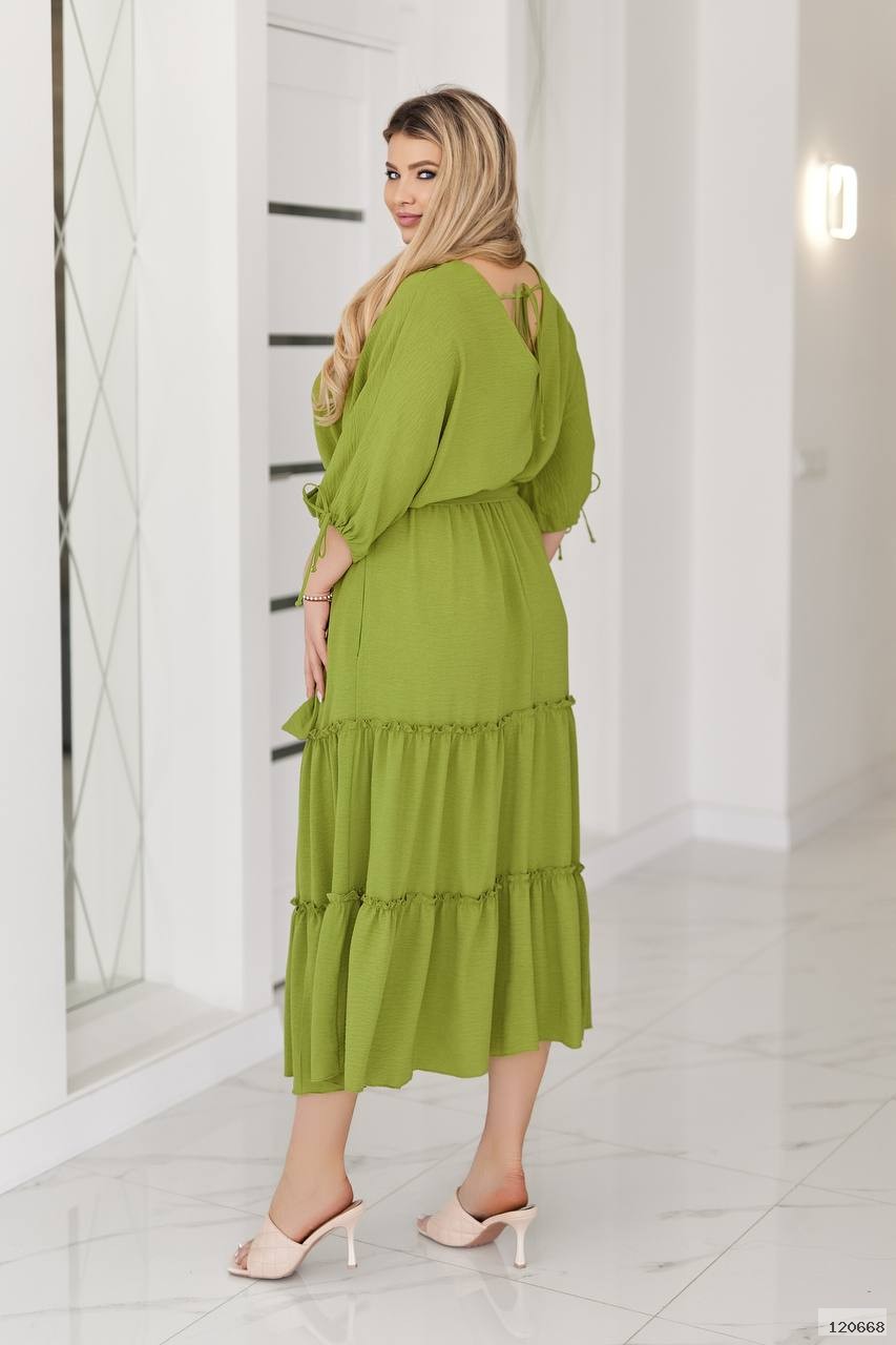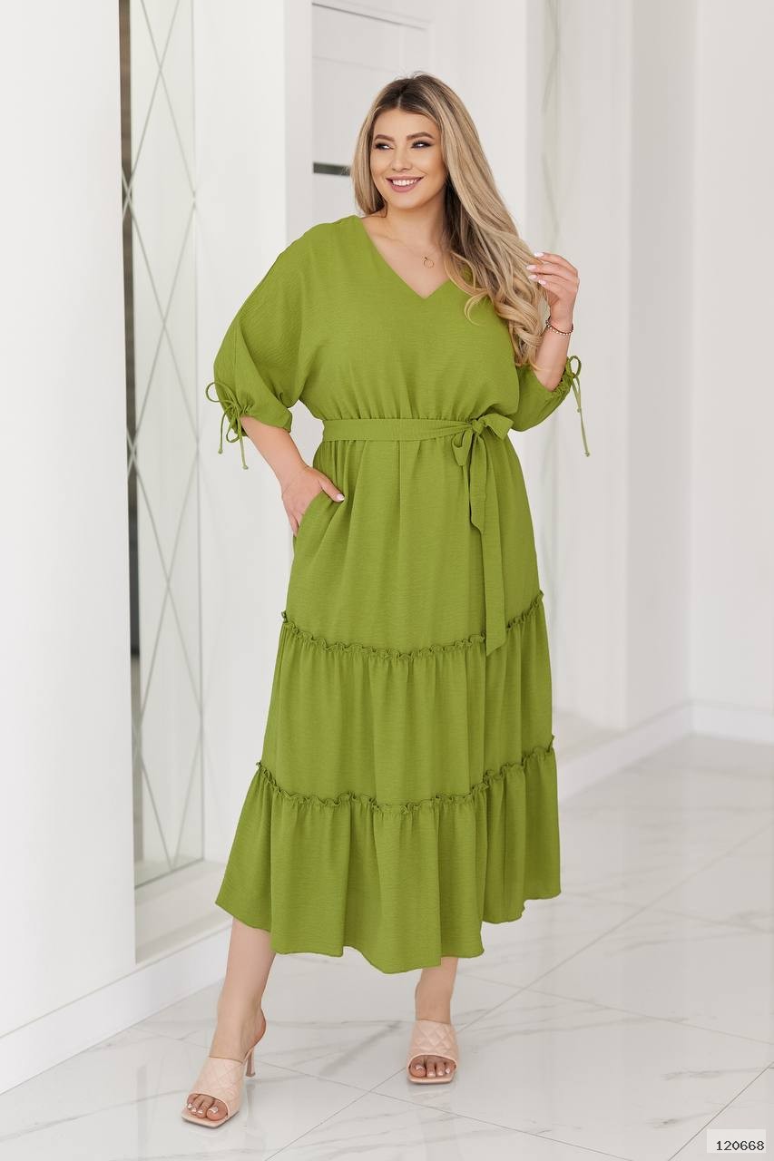 Легка , неймовірна сукня , що летить ! Вільний крій, на грудях і спині з V-подібним вирізом, талія - на гумці з поясом, рукав кажан на зав'язках. Шикарна, широка, ярусна спідниця та приголомшливі літні кольори підкорять ваше серце!