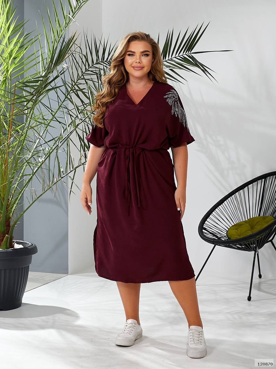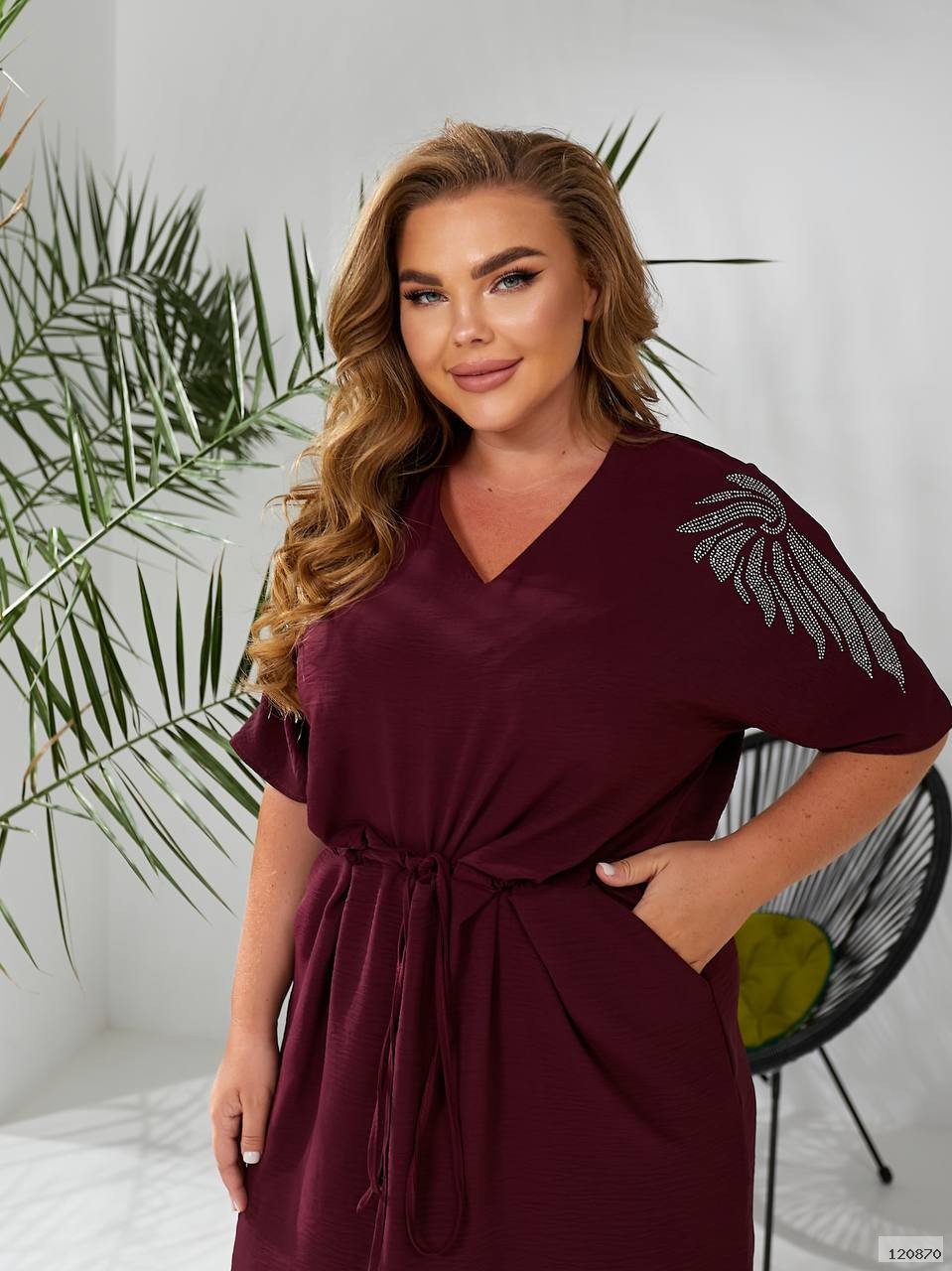 Сукня затягується на куліску на талії, з боків розрізи, кишені, плечі декоровані камінням