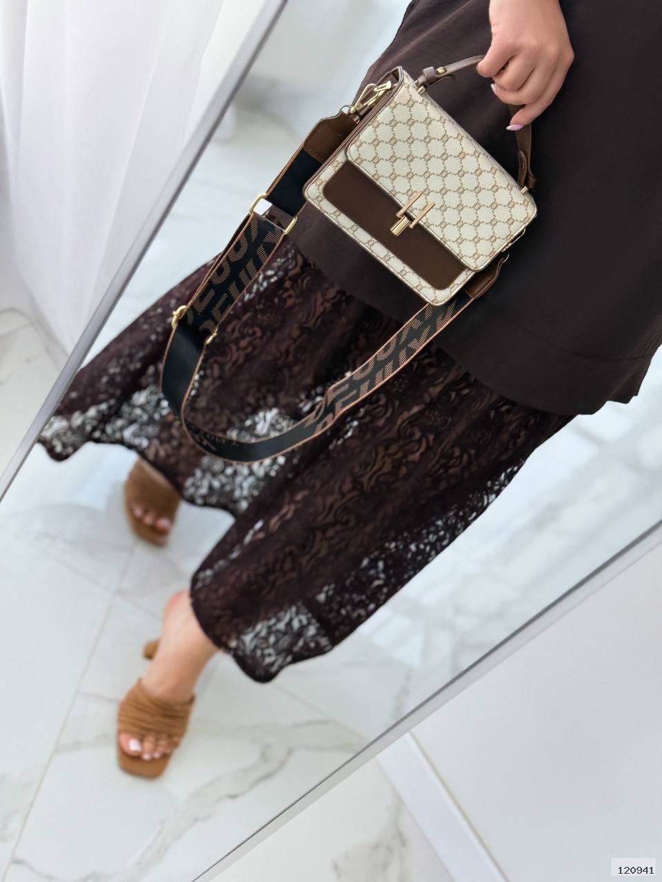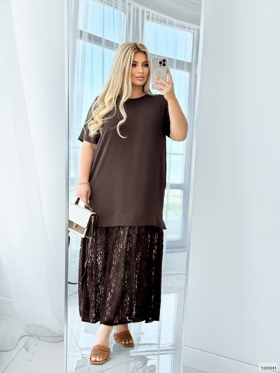 Сукня відрізняється оригінальним поєднанням стилів та фактур. Верхня частина виконана у вигляді вільної футболки з коротким рукавом, наголошуючи на комфортності виробу. Спідниця виконана з елегантного гіпюру, що створює легку легкість та жіночність силуету. Сукня має довжину в підлогу, візуально подовжує фігуру і надає образу романтичності та витонченості.
