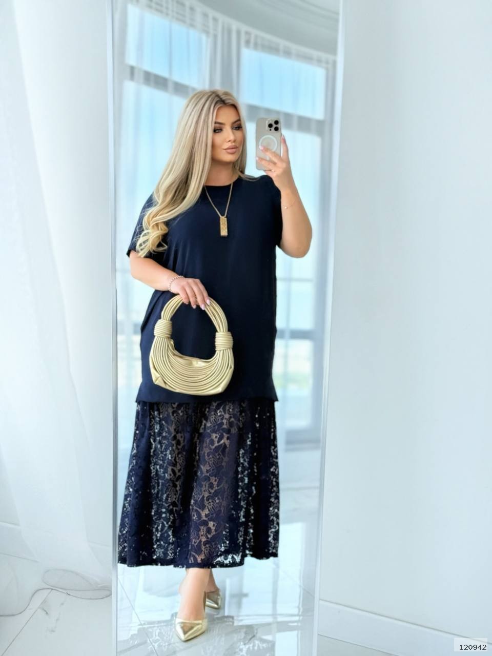 Сукня відрізняється оригінальним поєднанням стилів та фактур. Верхня частина виконана у вигляді вільної футболки з коротким рукавом, наголошуючи на комфортності виробу. Спідниця виконана з елегантного гіпюру, що створює легку легкість та жіночність силуету. Сукня має довжину в підлогу, візуально подовжує фігуру і надає образу романтичності та витонченості.