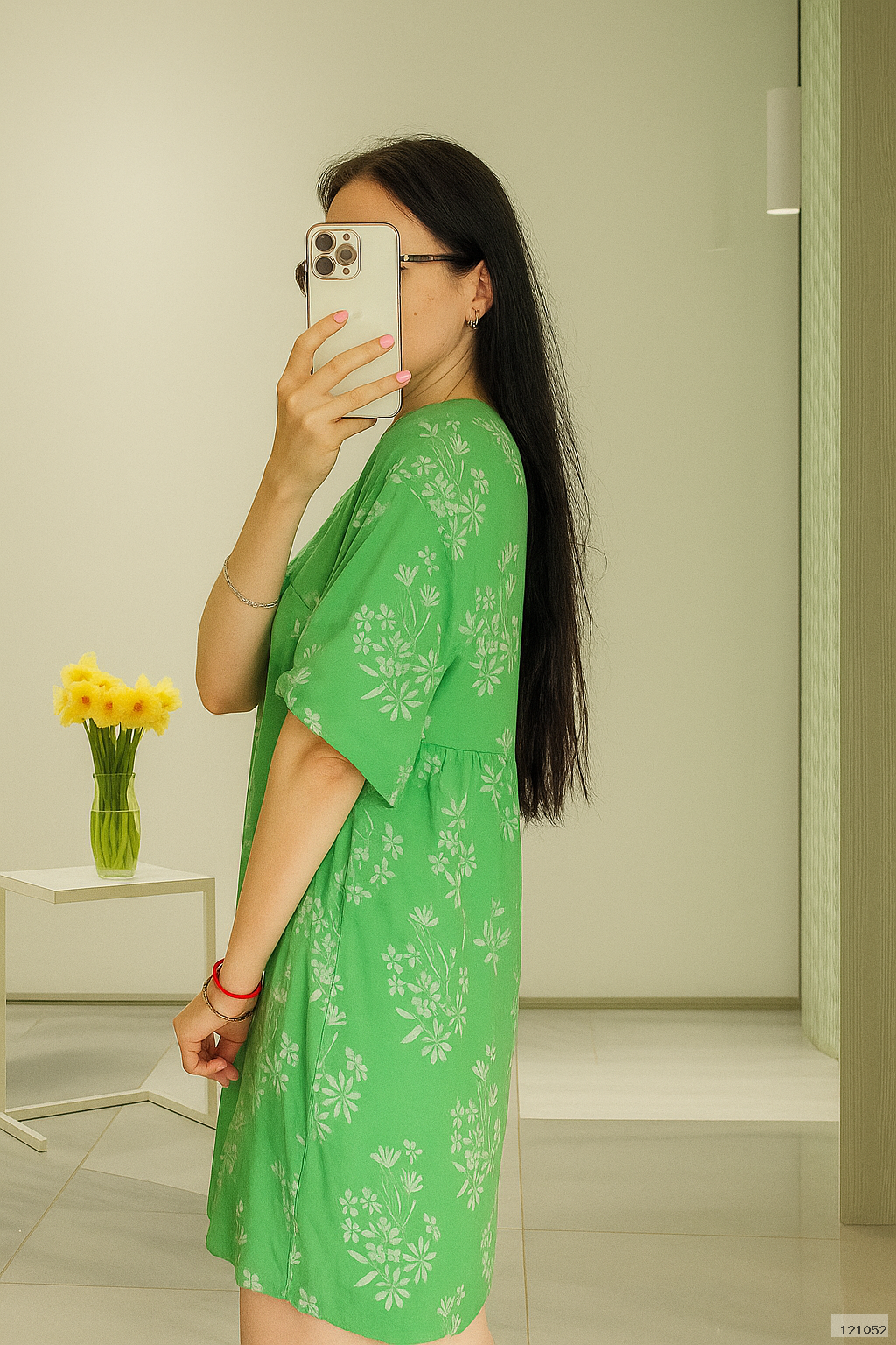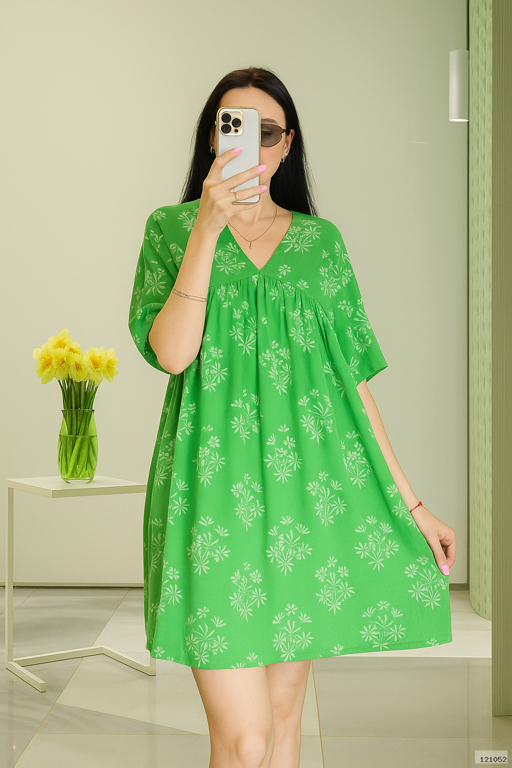Легка літня сукня вільного крою з ніжним квітковим принтом. Виготовлена з м’якої, дихаючої тканини, ідеально підходить для спекотної погоди. Має V-подібний виріз, короткі рукави та комфортну довжину міні. Завдяки вільному силуету забезпечує максимальний комфорт і свободу рухів. Сукня створює легкий, романтичний образ і чудово пасує для прогулянок, подорожей або відпочинку на природі.