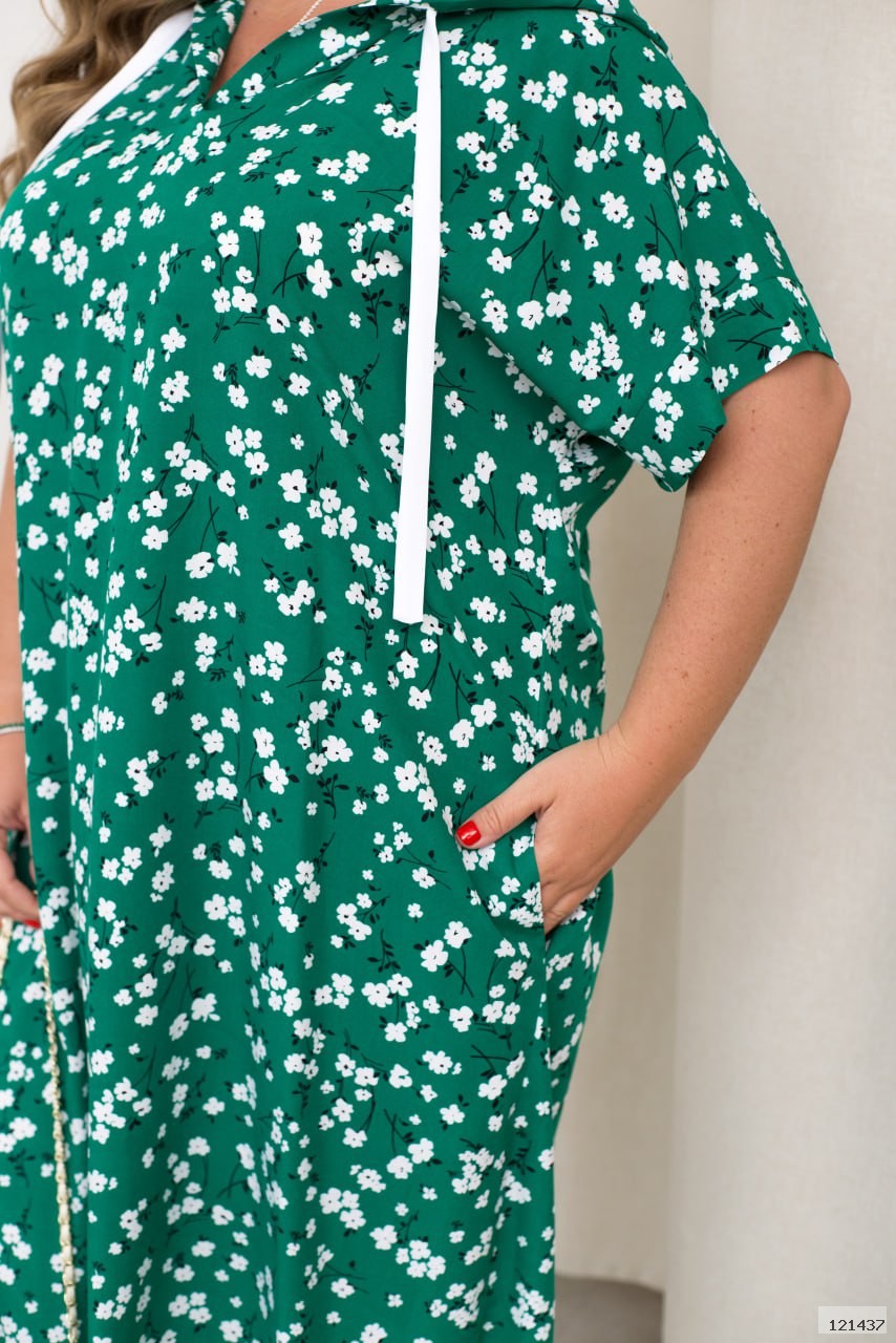 Ця легка сукня в спортивному стилі — твій must-have для активних і стильних днів. Зручний V-подібний виріз переходить у капюшон зі шнурком-стрічкою — виглядає стильно й незвично. Спущені рукави з манжетом дарують свободу рухів, а кишені з боків — зручність на кожен день. Поділ подовжено ззаду та красиво заокруглений, бічні розрізи додають легкості й підкреслюють жіночність. Ідеально поєднується з кросівками або улюбленими сандалями.