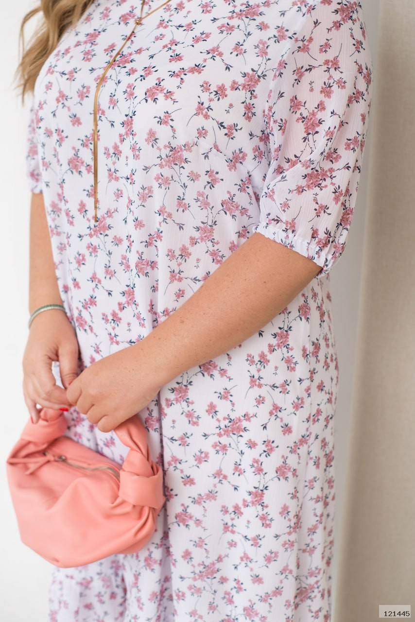 Сукня з легкого шифону — ідеальний вибір для теплих днів. Вона має комфортний вільний крій, що дарує відчуття легкості, а довжина міді з воланом внизу додає грайливості та жіночності. Рукави до ліктя з м’якою резиночкою роблять образ стильним і зручним. Модель доповнена трикотажною підкладкою для твого комфорту, а по спинці до волана проходить акуратний шов, який додає силуету охайності та гарної посадки.