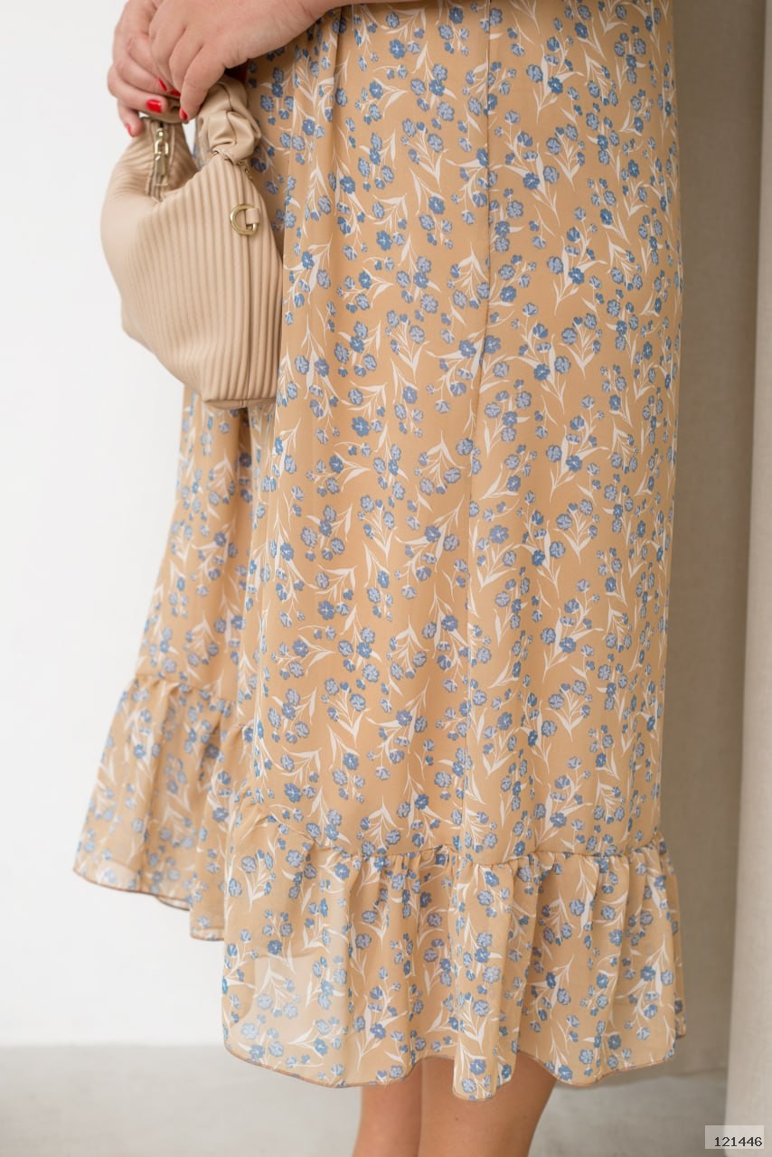 Сукня з легкого шифону — ідеальний вибір для теплих днів. Вона має комфортний вільний крій, що дарує відчуття легкості, а довжина міді з воланом внизу додає грайливості та жіночності. Рукави до ліктя з м’якою резиночкою роблять образ стильним і зручним. Модель доповнена трикотажною підкладкою для твого комфорту, а по спинці до волана проходить акуратний шов, який додає силуету охайності та гарної посадки.