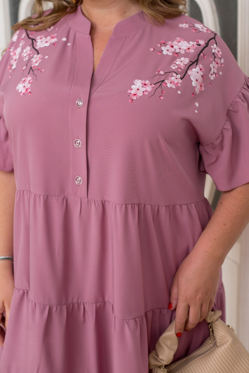 Ця сукня з ніжного софту — просто мрія для теплих сонячних днів. V-подібний виріз у поєднанні з акуратним комірцем красиво підкреслює зону декольте й додає образу витонченості. Спереду — ряд декоративних ґудзиків, які не лише стильні, а й додають сукні особливого шарму. Рукава-крильця створюють легкий, романтичний настрій, а спідниця з трьома воланами грайливо розвівається з кожним кроком. Ідеальна форма для тих, хто любить поєднувати комфорт і жіночність.