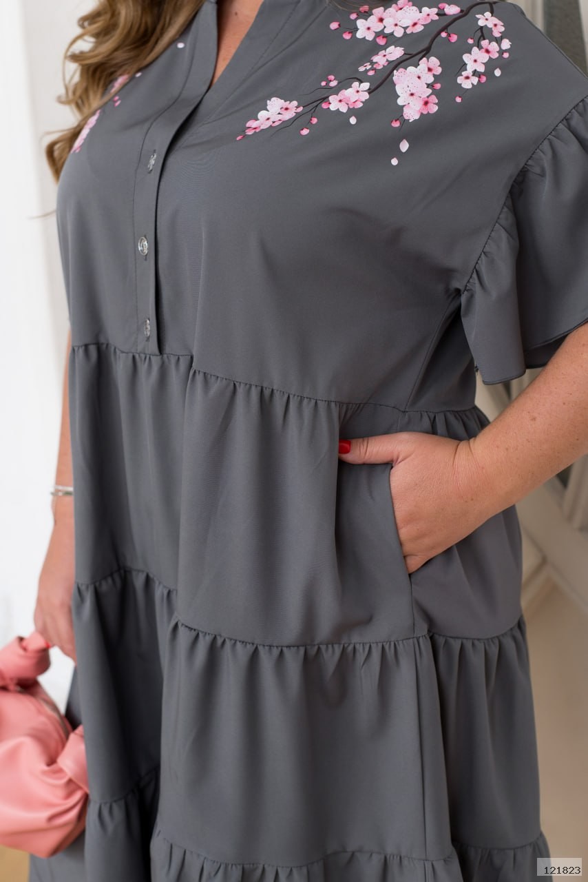 Ця сукня з ніжного софту — просто мрія для теплих сонячних днів. V-подібний виріз у поєднанні з акуратним комірцем красиво підкреслює зону декольте й додає образу витонченості. Спереду — ряд декоративних ґудзиків, які не лише стильні, а й додають сукні особливого шарму. Рукава-крильця створюють легкий, романтичний настрій, а спідниця з трьома воланами грайливо розвівається з кожним кроком. Ідеальна форма для тих, хто любить поєднувати комфорт і жіночність.