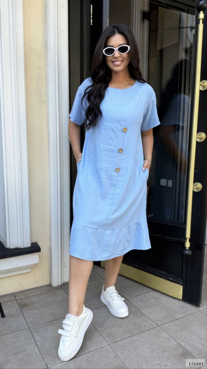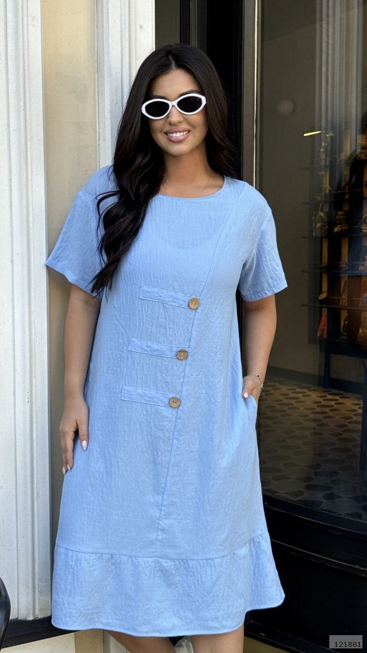 Сукня вільного крою, має бічні кишені, декорована ґудзиками. Тканина дуже легка, не парить, не потребує прасування.