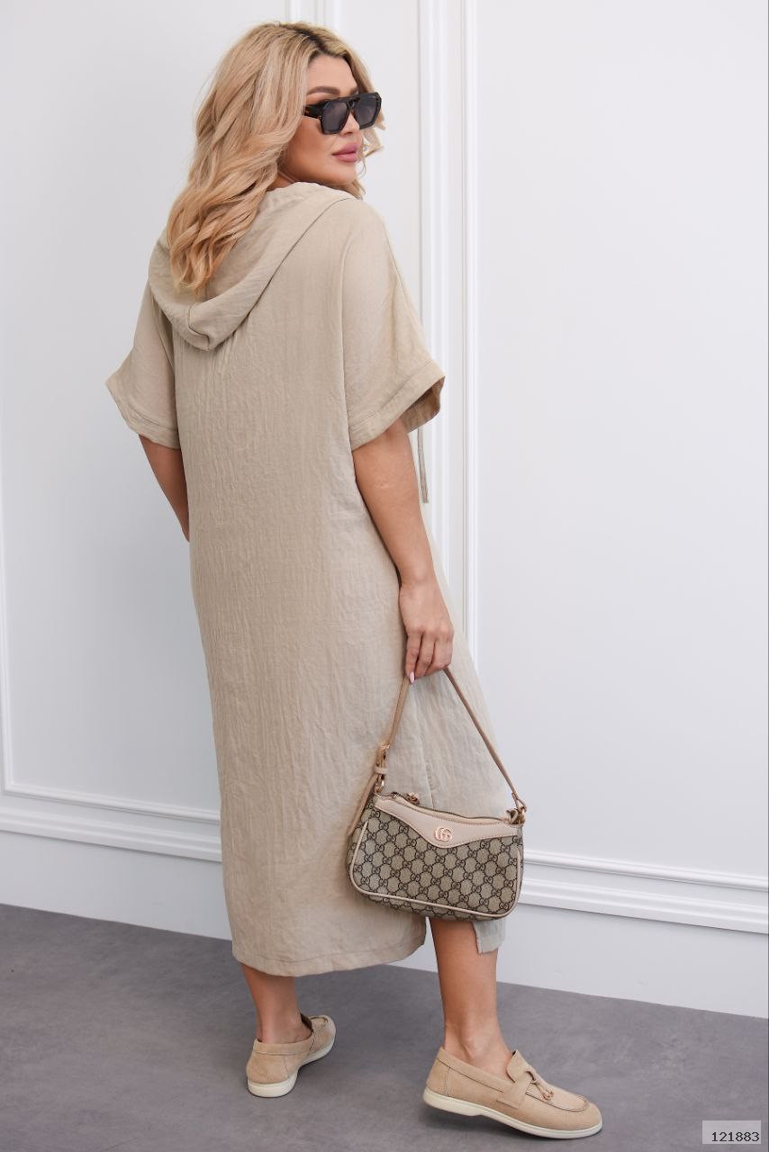 Крутезна сукня вільного крою з капюшоном, бічними кишенями і розрізами. Тканина дуже легка, не парить, не потребує прасування.