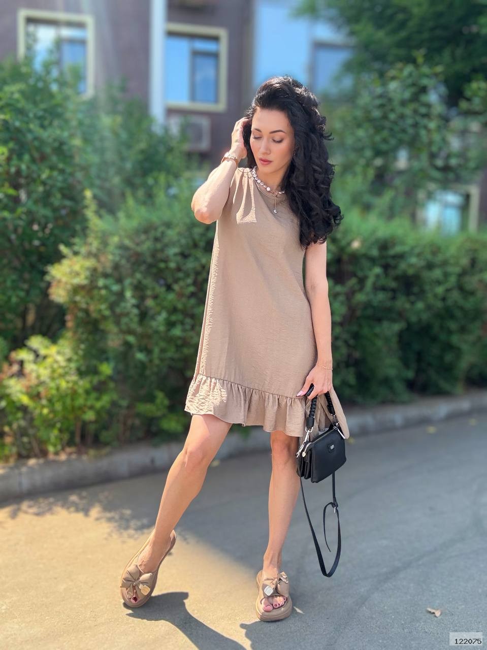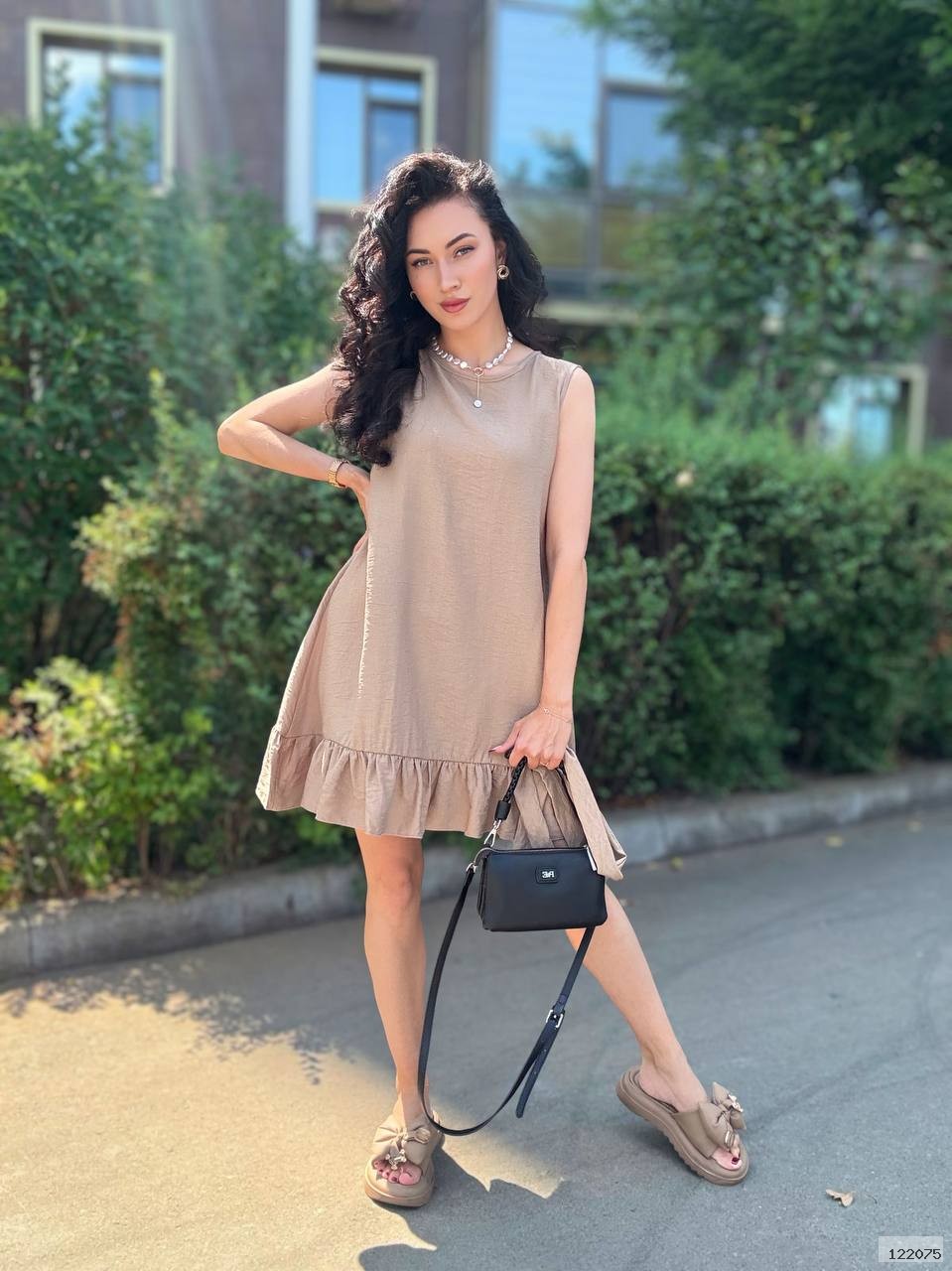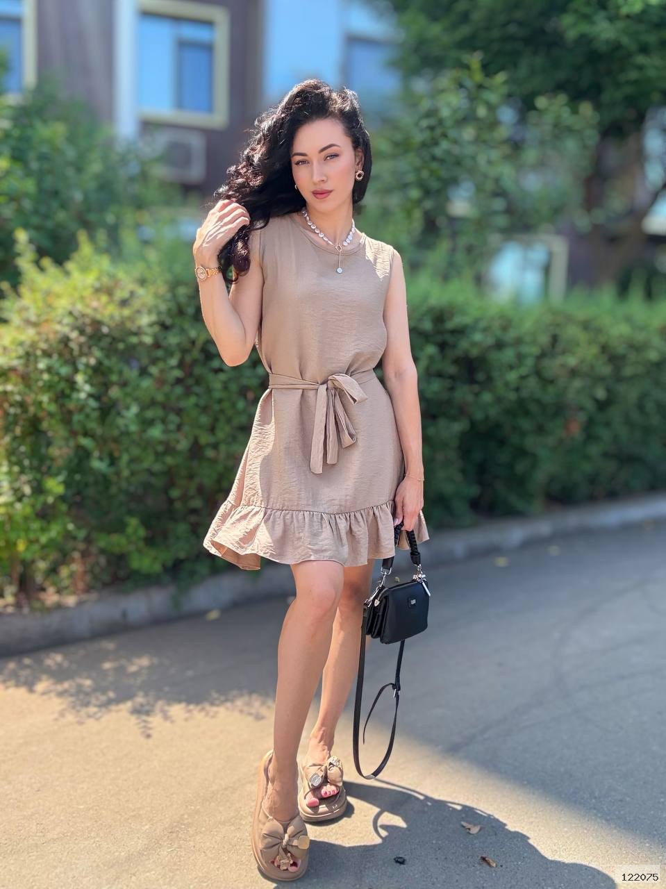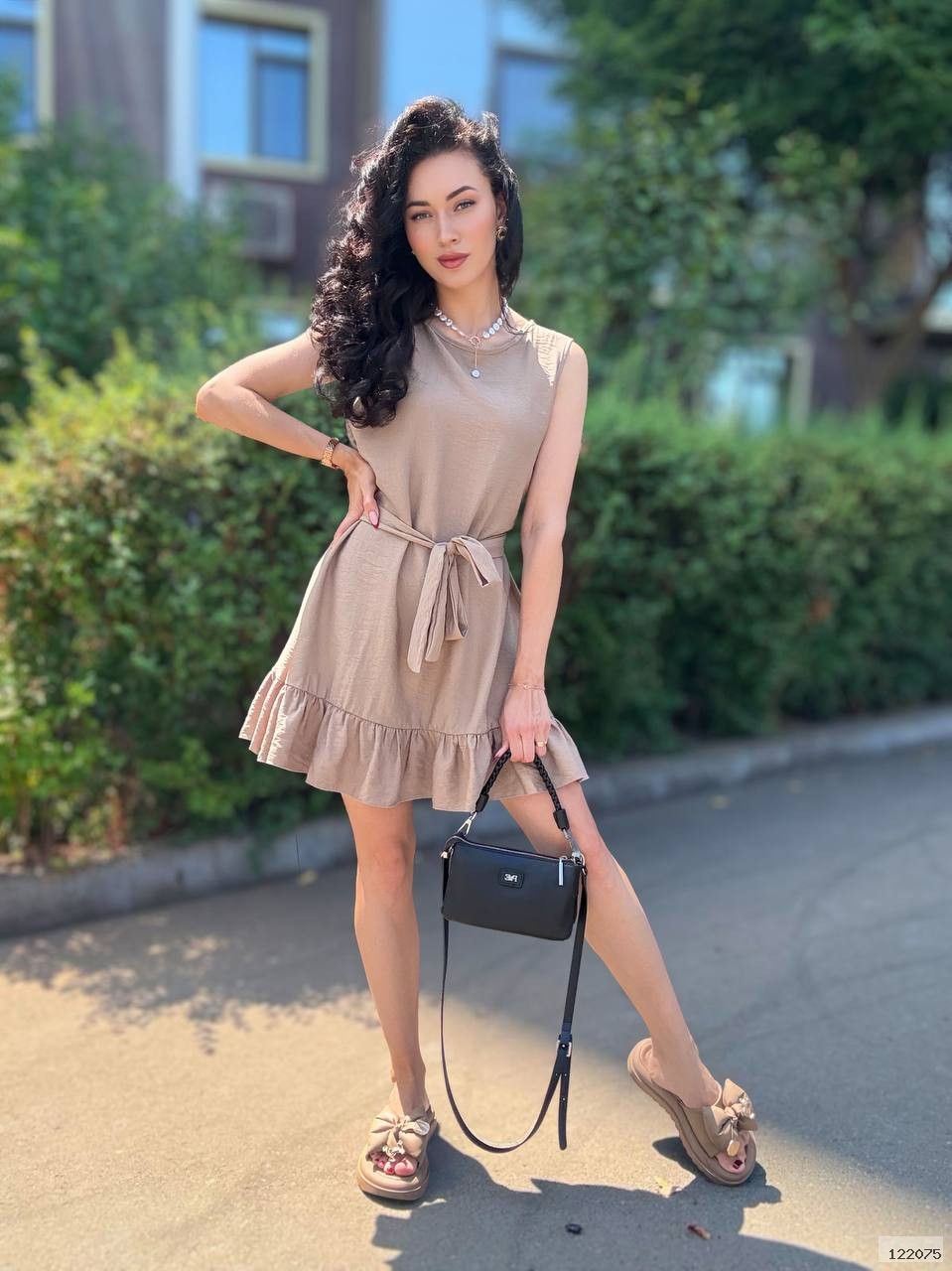 Сукня з поясом в комплекті поєднує в собі елегантність та комфорт. Виготовлена з льону, вона має приємну на дотик текстуру з невеликими ефектами жатки, що надає їй особливий шарм. Легка і дихаюча тканина ідеально підходить для теплих днів.