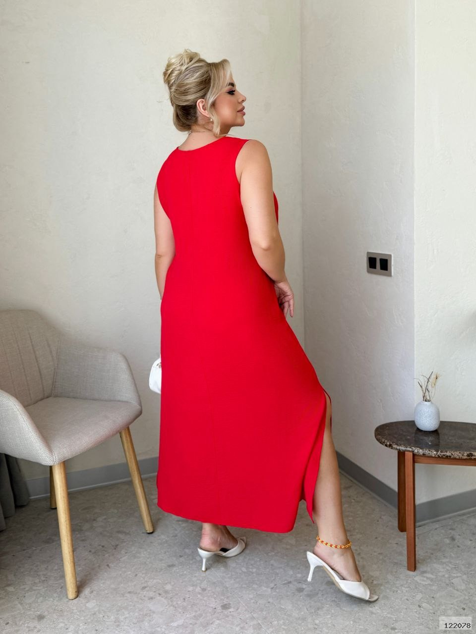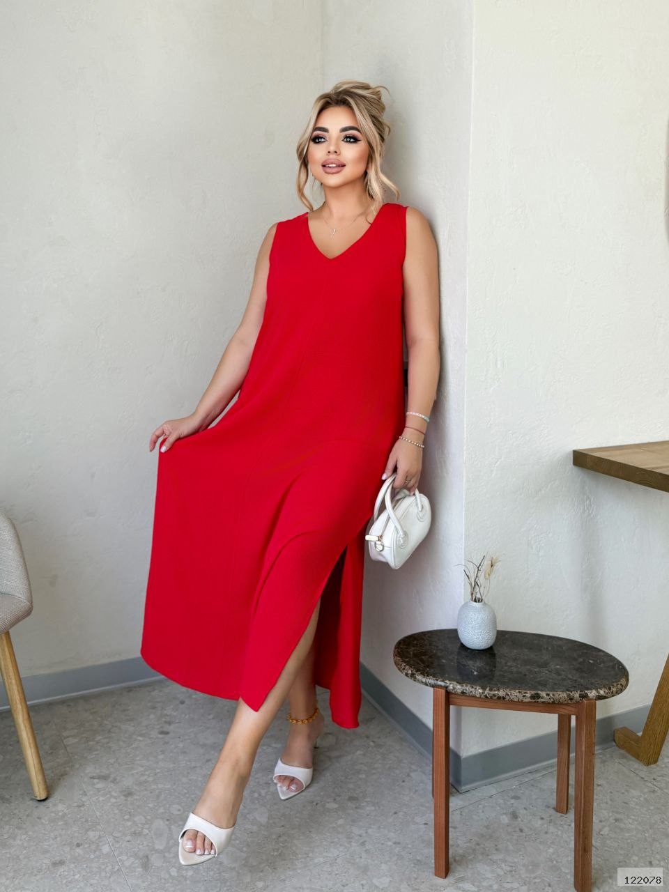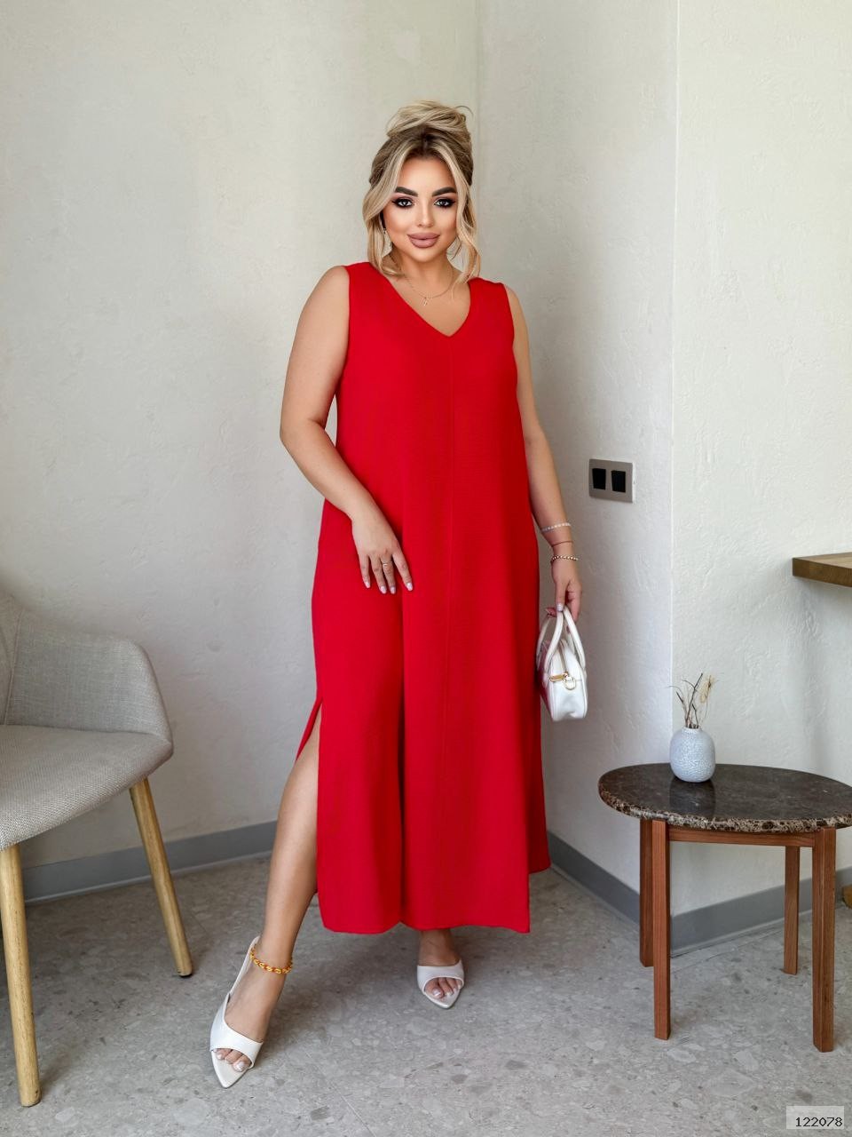 Вільна,сучасна,стримана сукня з v образним вирізом на груді та розрізами вздовж боків.