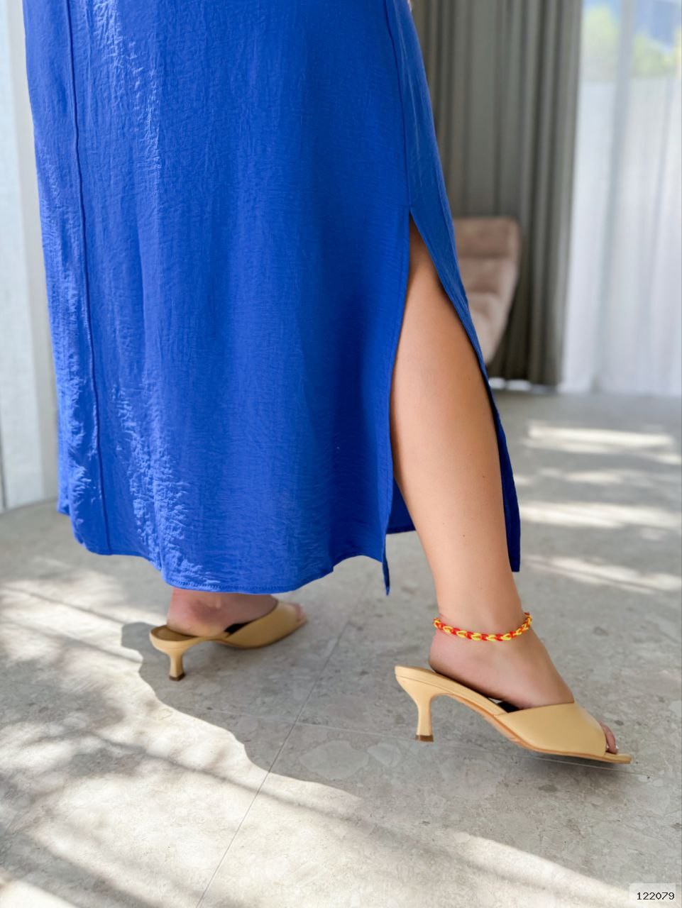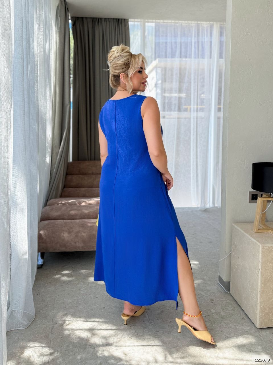 Вільна,сучасна,стримана сукня з v образним вирізом на груді та розрізами вздовж боків.