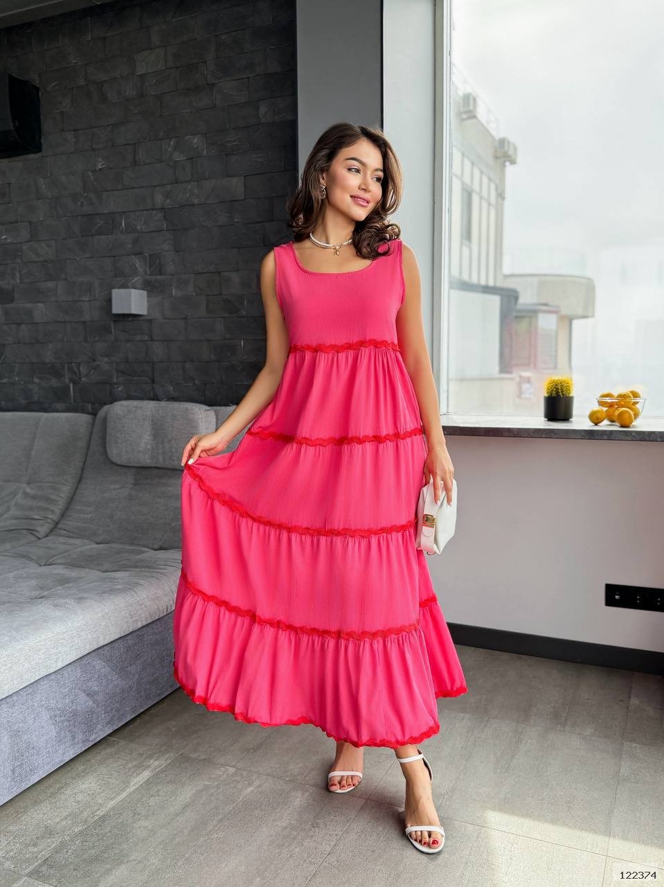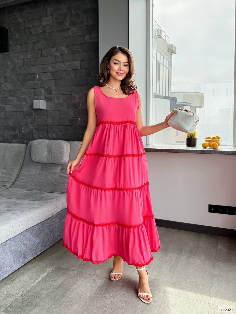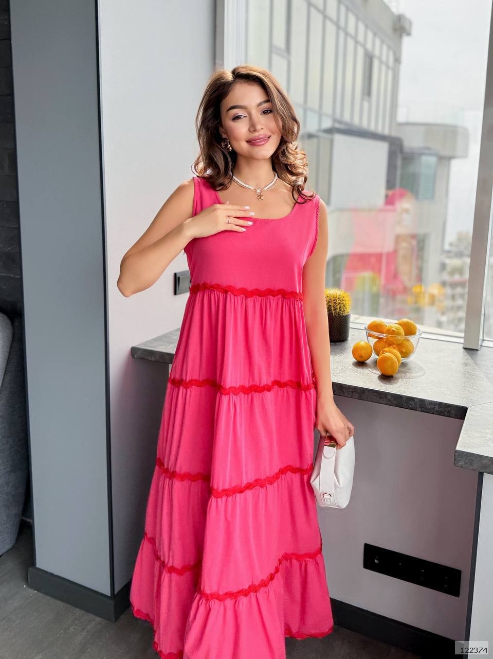 Легкий жіночий сарафан максі довжини з м’якої приємної тканини. Має вільний фасон, що не сковує рухів, та оздоблений хвилястими декоративними вставками. Зручна потайна блискавка збоку забезпечує комфортне одягання. Ідеальний для літа, прогулянок і відпочинку.