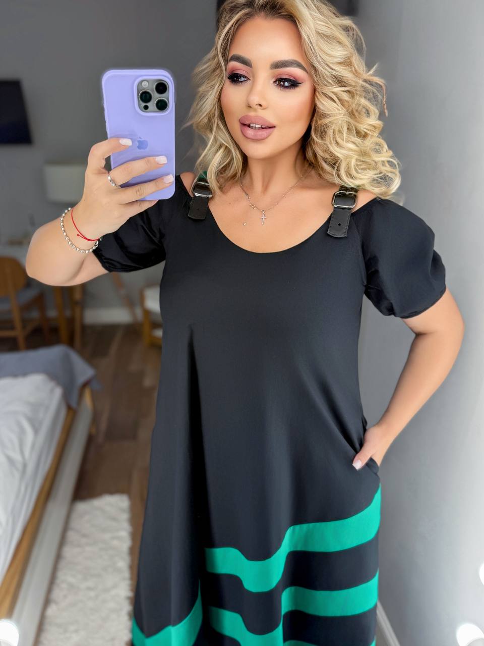 Плаття вільного крою з цікавими елементами : на плечах застібки зі шкіри ( регулюється довжина лямок). По низу плаття спереду та ззаду , на плечах кольорові вставки. Рукава нижче ліктя на резинці.