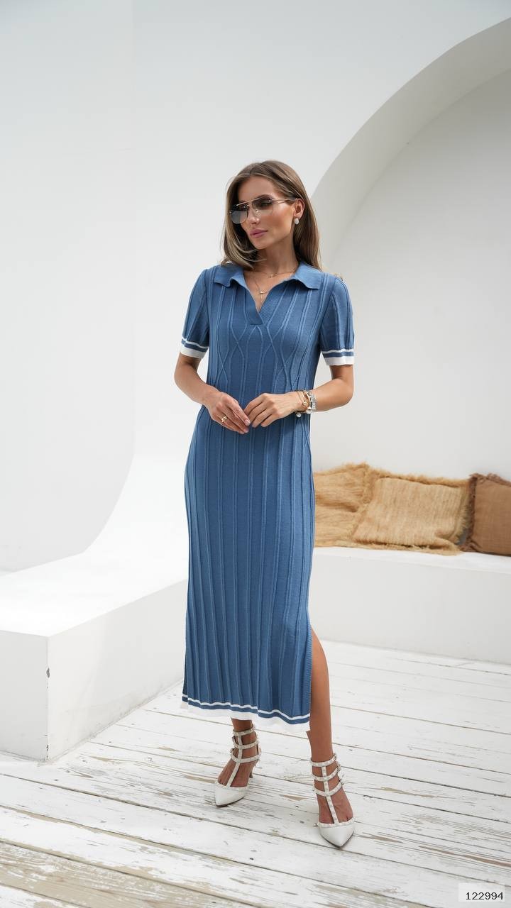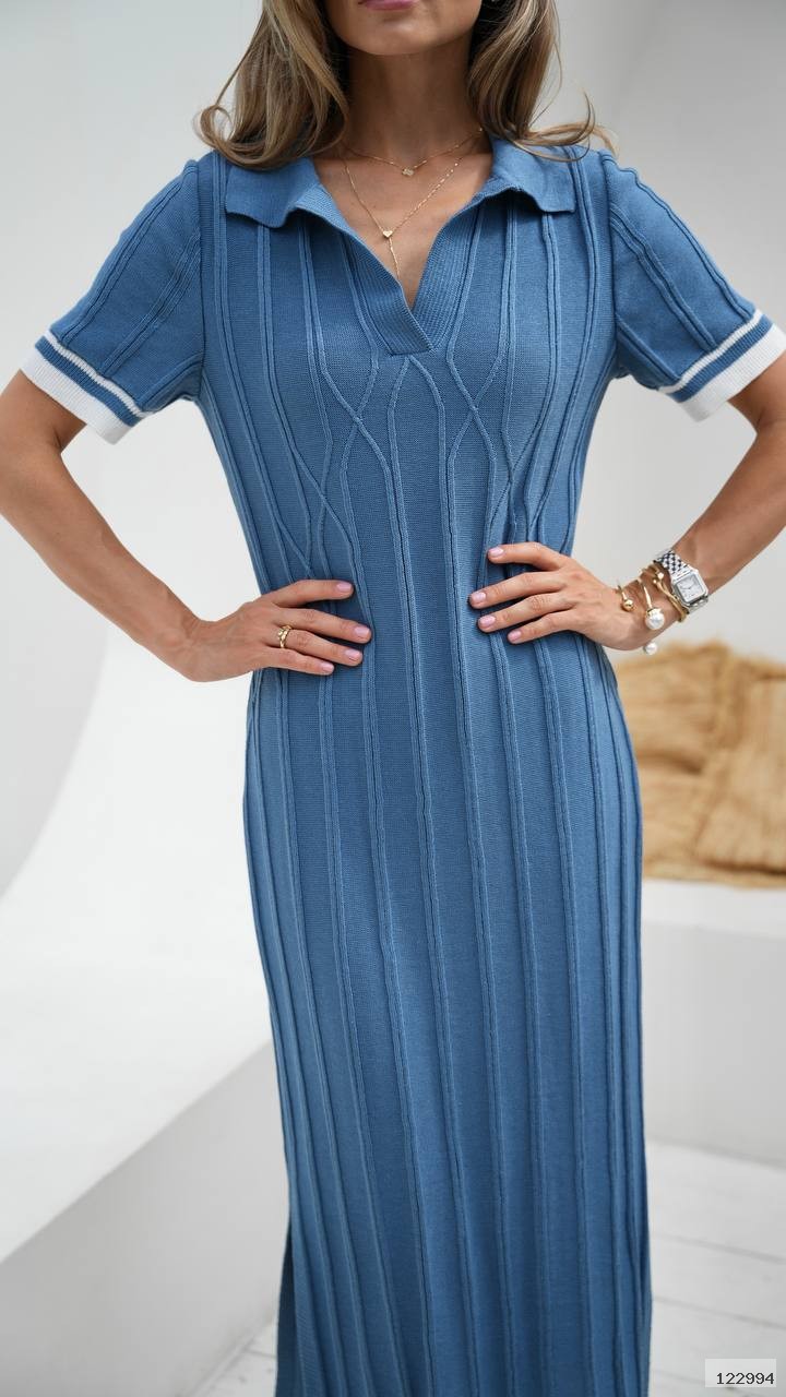 Зустрічайте нашу нову модель в’язаної сукні – це універсальна база з акцентом на деталі: фактурна вертикальна в’язка, розріз збоку, елегантний комір-поло та контрастні лінії.