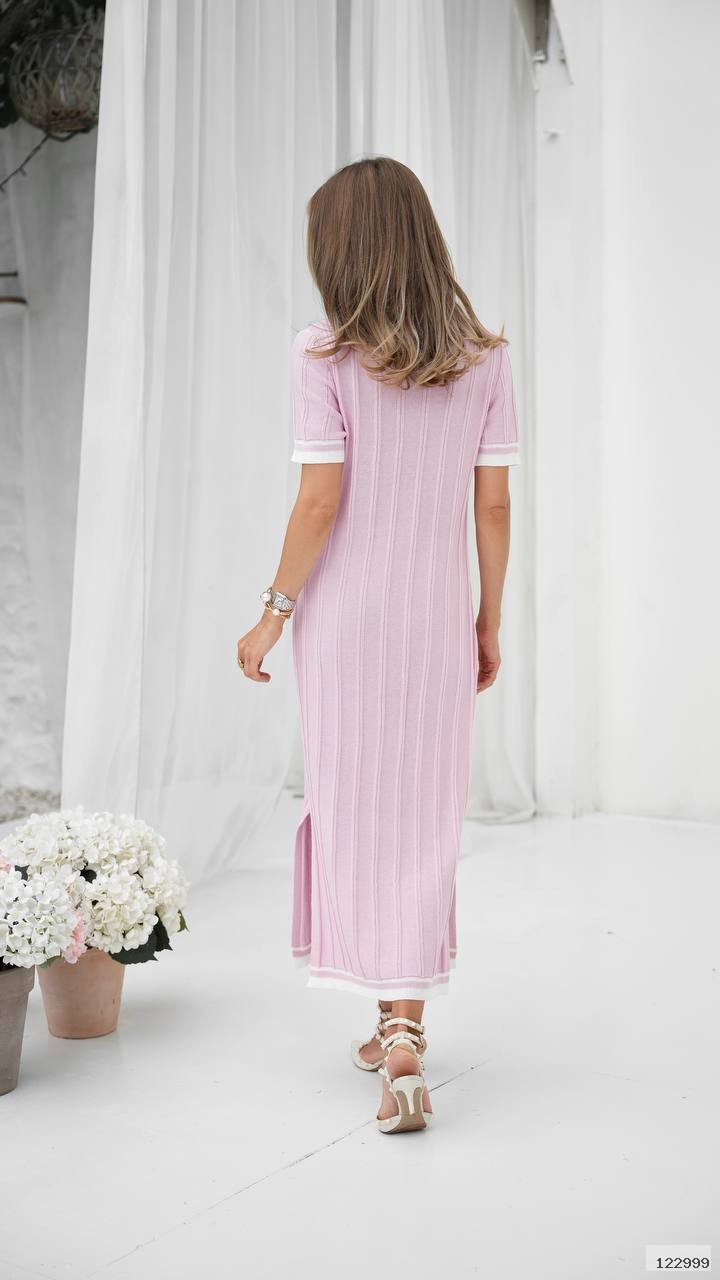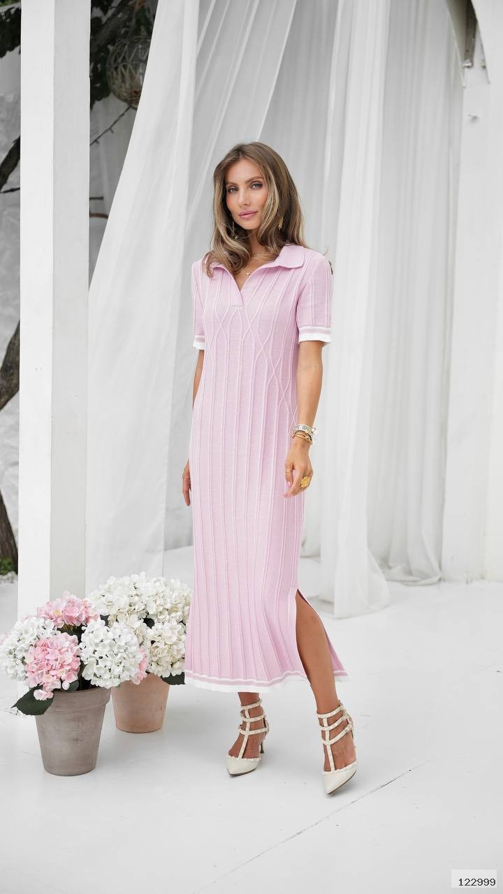 Зустрічайте нашу нову модель в’язаної сукні – це універсальна база з акцентом на деталі: фактурна вертикальна в’язка, розріз збоку, елегантний комір-поло та контрастні лінії.
