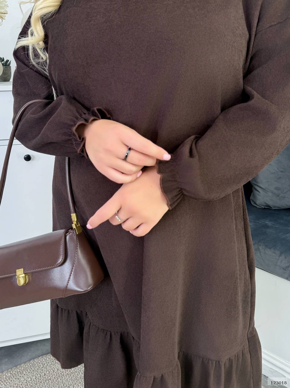 Ця сукня — ідеальний вибір для осені! Вільний фасон та приємна на дотик тканина вельвет додають елегантності та комфорту. Знизу сукні — невелика рюша, що додає жіночності, а приспущений рукавчик створює стильний і невимушений вигляд.