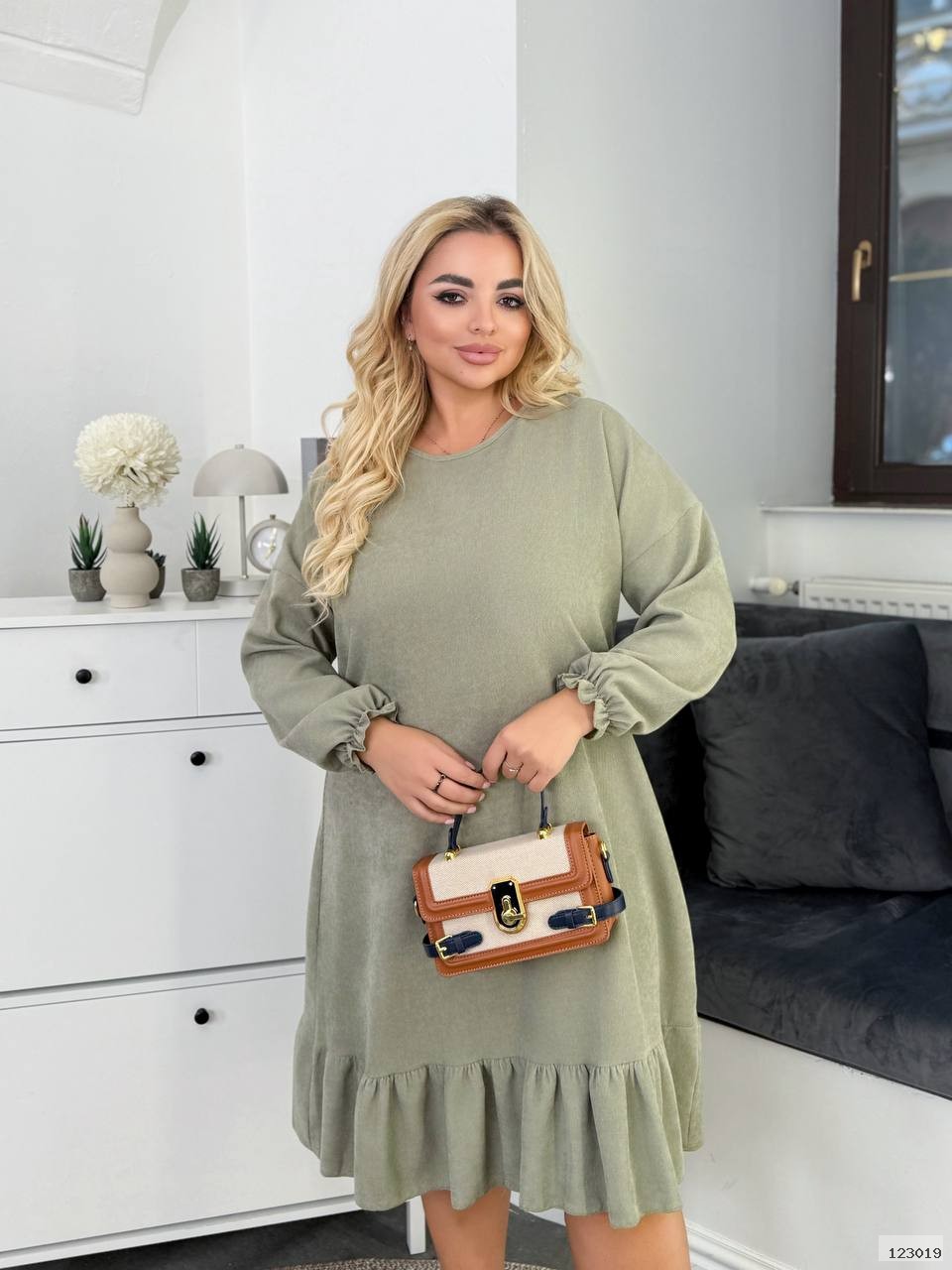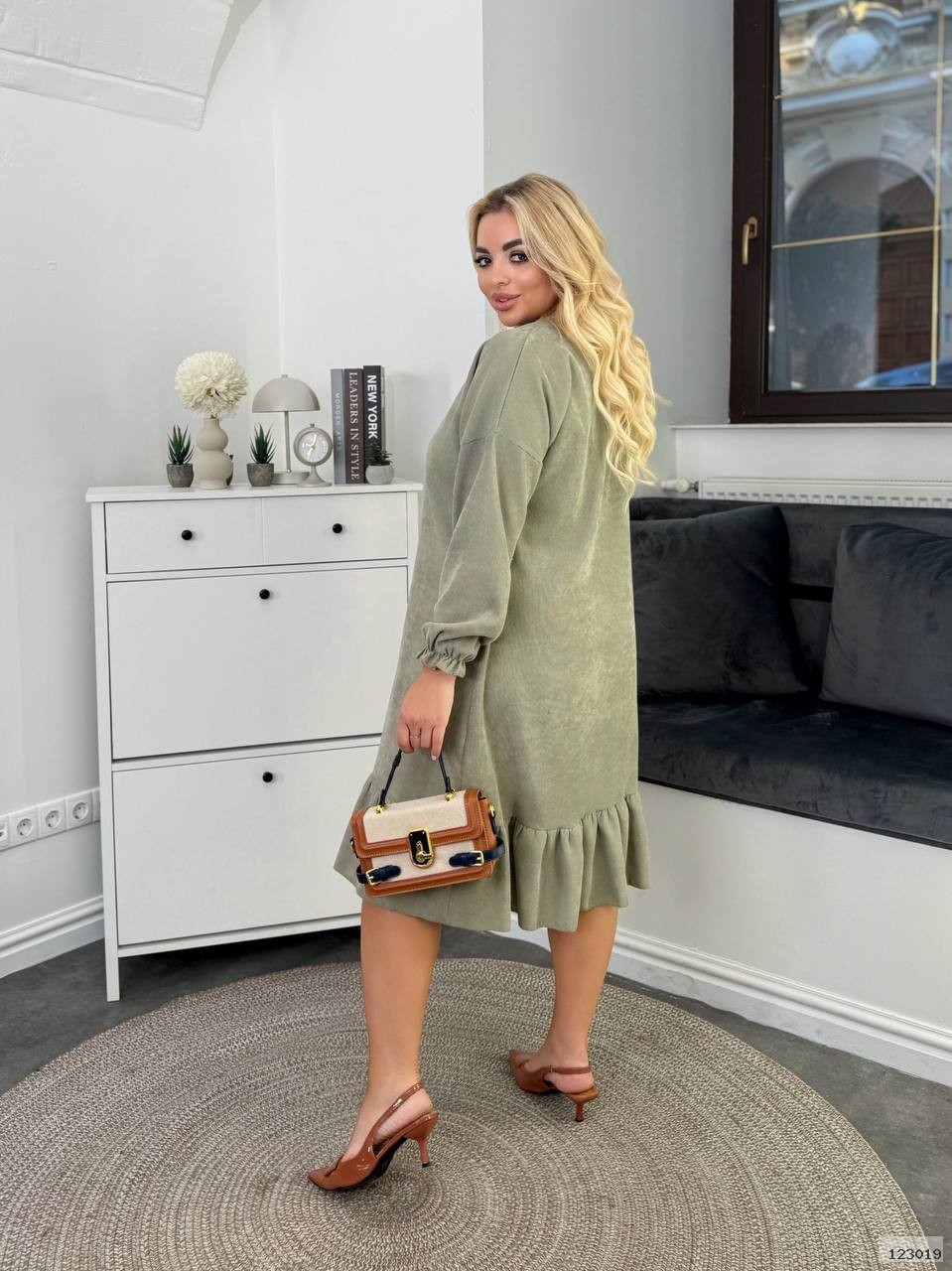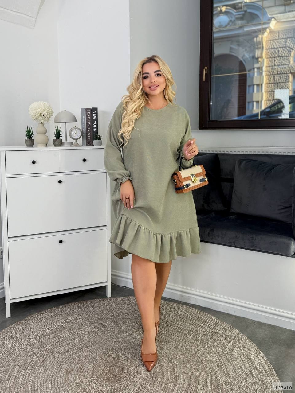 Ця сукня — ідеальний вибір для осені! Вільний фасон та приємна на дотик тканина вельвет додають елегантності та комфорту. Знизу сукні — невелика рюша, що додає жіночності, а приспущений рукавчик створює стильний і невимушений вигляд.