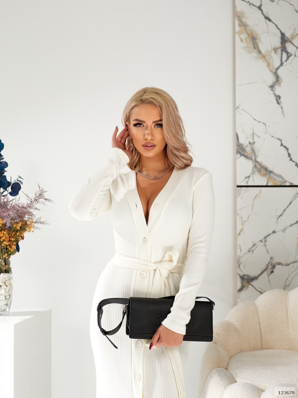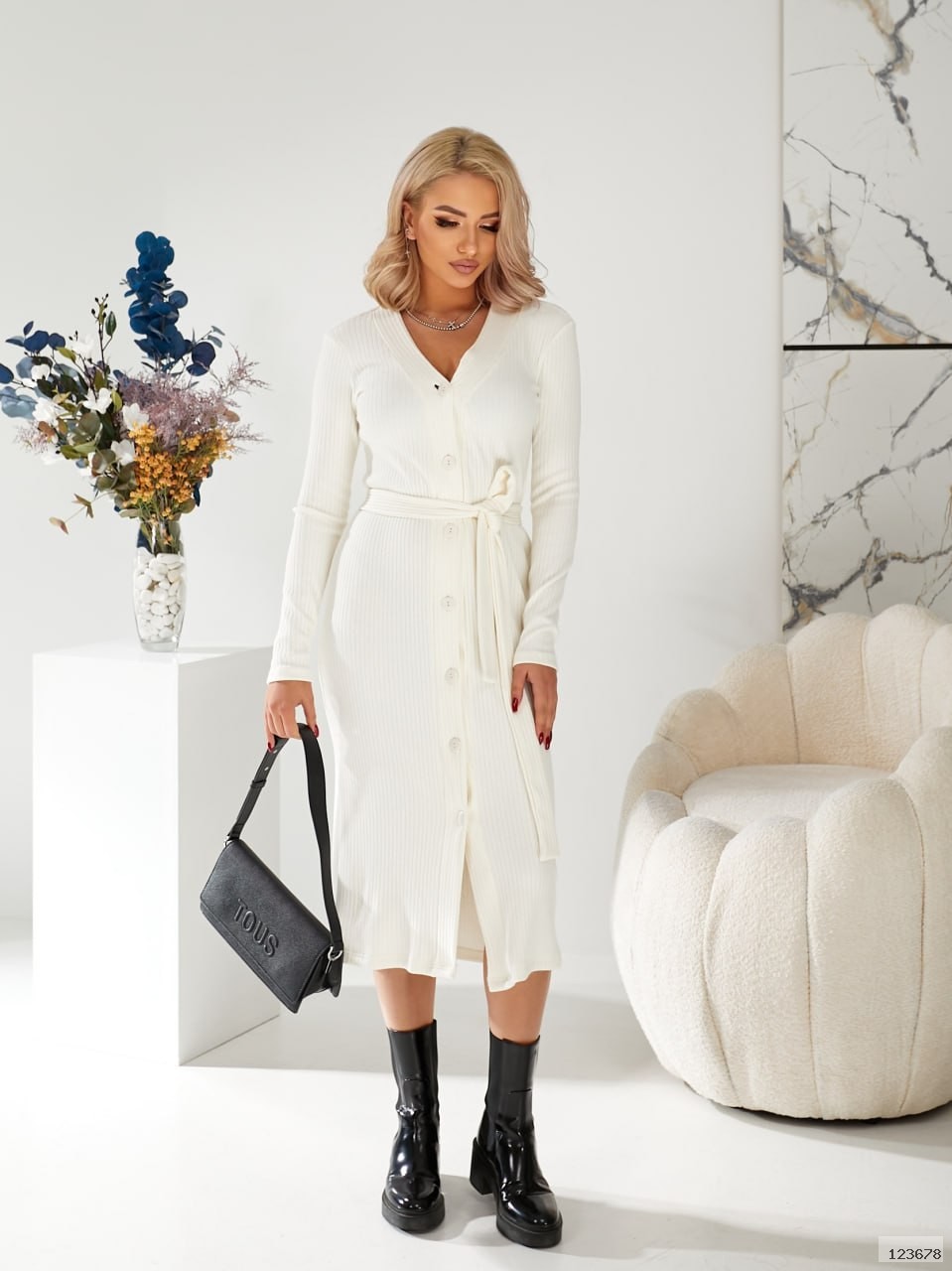 Стильна в'язана сукня міді-довжини з довгим рукавом, що ідеально поєднує елегантність і комфорт. Вона має приталений силует завдяки знімному поясу, що зав’язується на талії. Спереду – ряд ґудзиків по всій довжині, які додають вишуканості та дозволяють регулювати глибину вирізу.