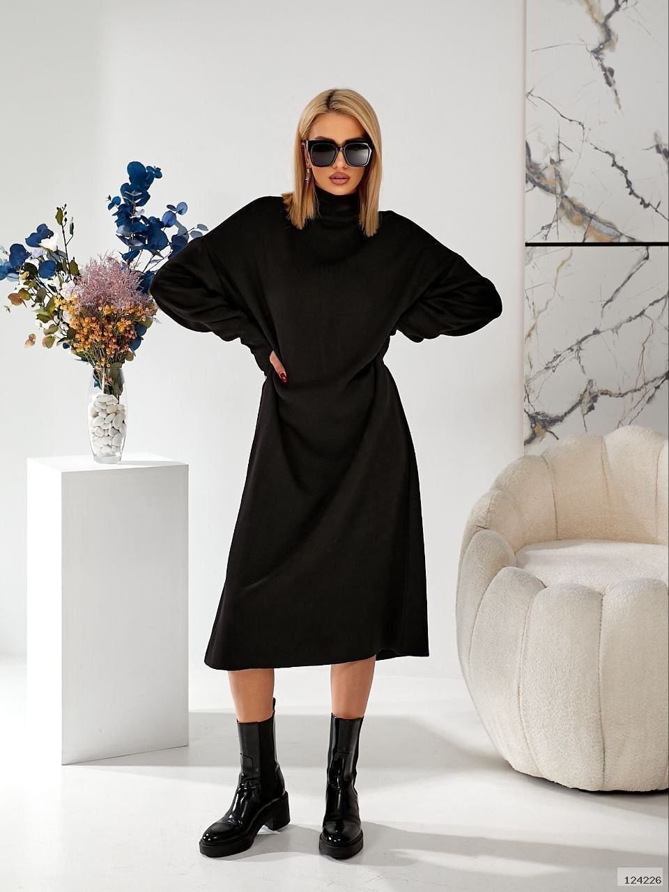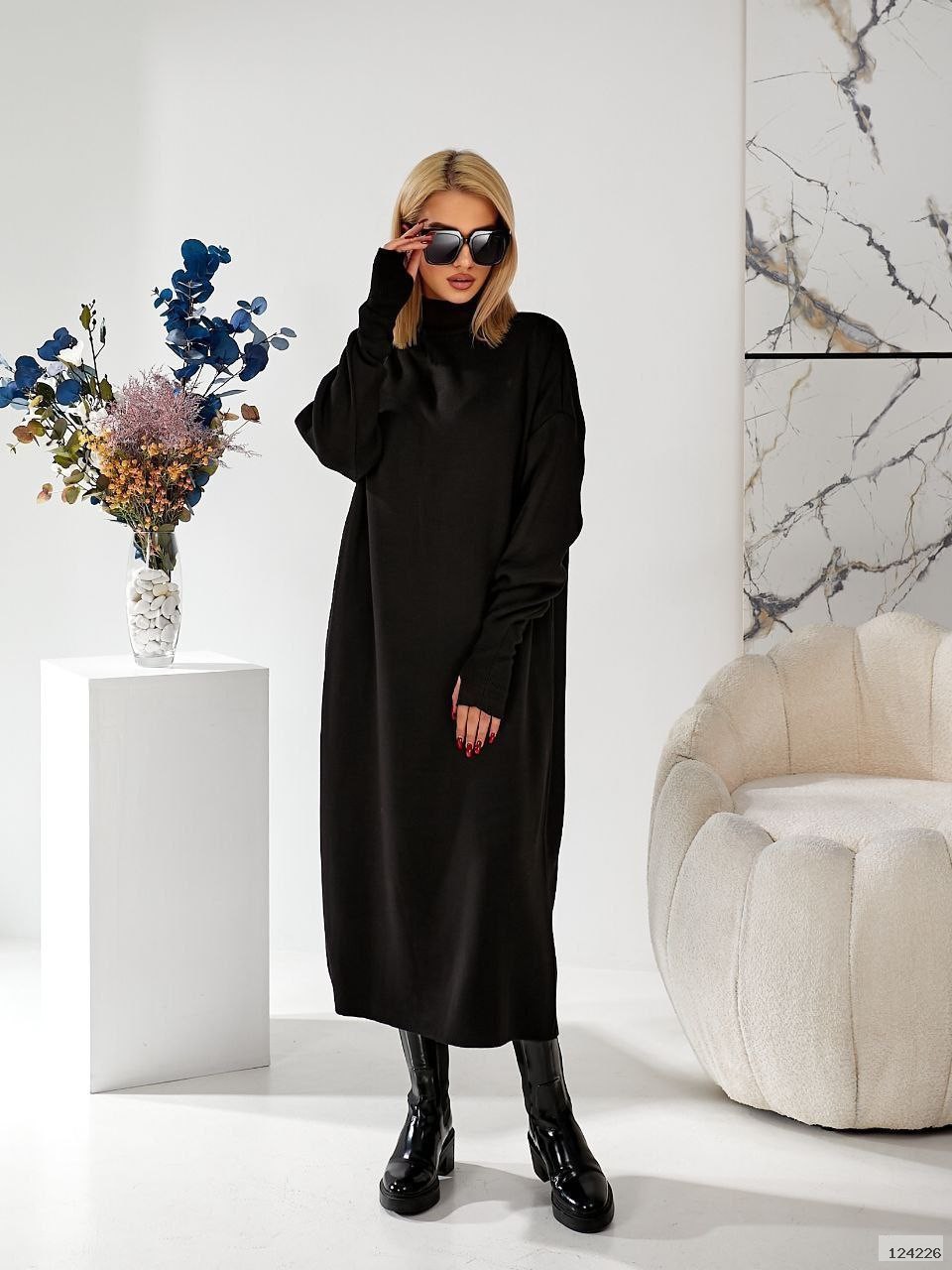 Сукня в стилі оверсайз. На рукавах стильні розрізи для пальців. В’язка добре тягнеться