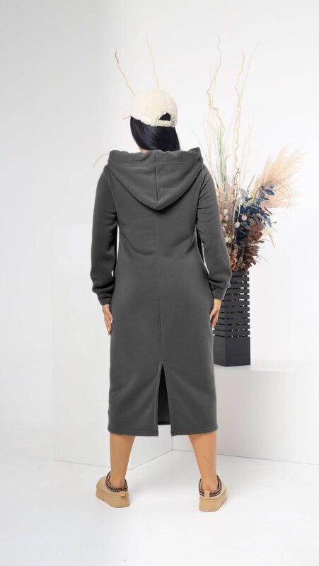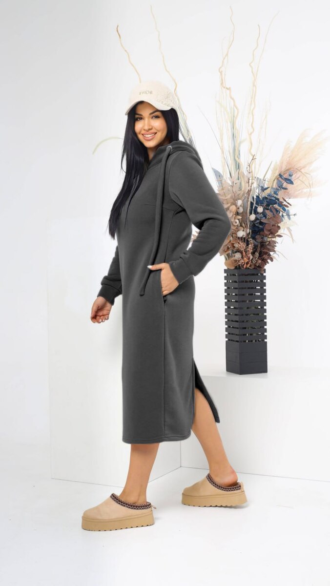 Сукня приталеного силуету з трьохнитки с начосом, відмінной якості. Глибокий капюшон і бічні кишені, рукава на манжеті. Тепло, затишно та неймовірно красиво.