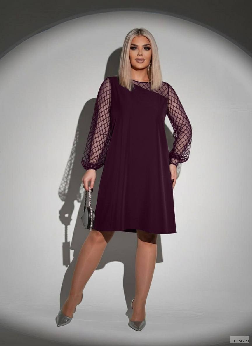 Елегантна сукня, яка має прямий вільний крій, що гарно сідає на будь-яку фігуру. Родзинка виробу — прозорі сітчасті вставки з малюнком у клітинку на рукавах та в зоні декольте, які додають образу вишуканості та ніжності.