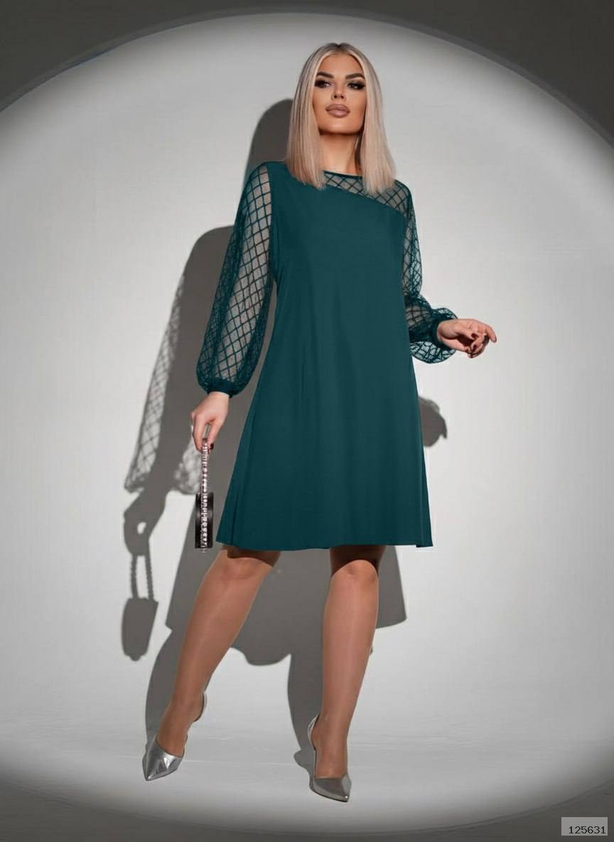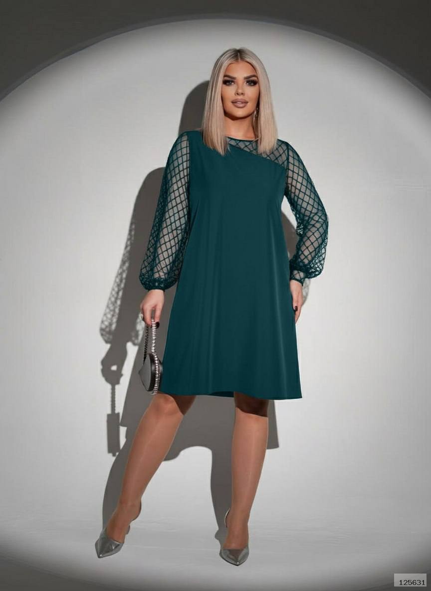 Елегантна сукня, яка має прямий вільний крій, що гарно сідає на будь-яку фігуру. Родзинка виробу — прозорі сітчасті вставки з малюнком у клітинку на рукавах та в зоні декольте, які додають образу вишуканості та ніжності.