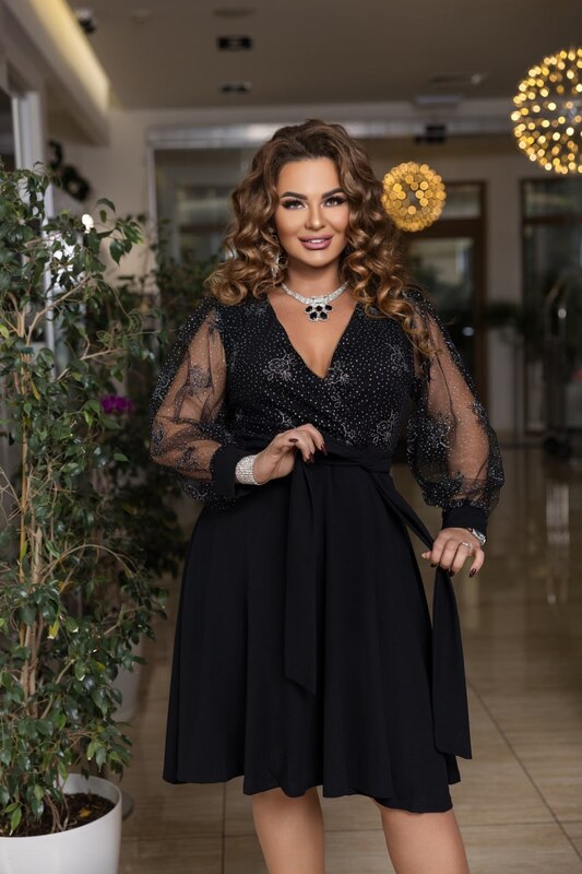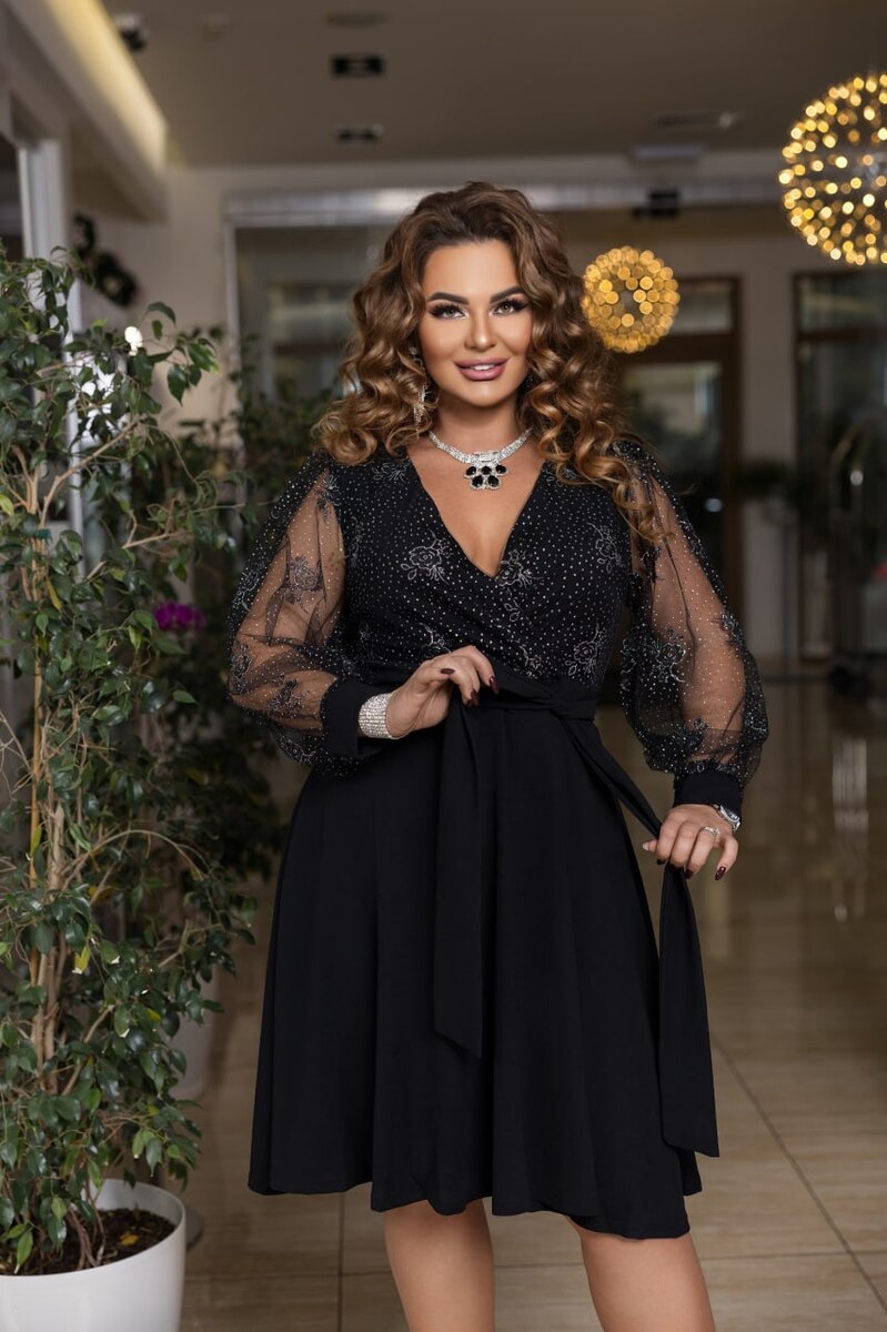 Елегантне жіноче плаття, виконане з кріп дайвінгу (тягнеться) і сітки з блиском. Перед сукні з імітацією запаху. До сукні додається знімний пояс із основної тканини. У такій сукні будь-яка жінка зможе відчути себе справжньої леді та королевою вечора, ця сукня здатна надати жінці ніжності, легкості та елегантності.