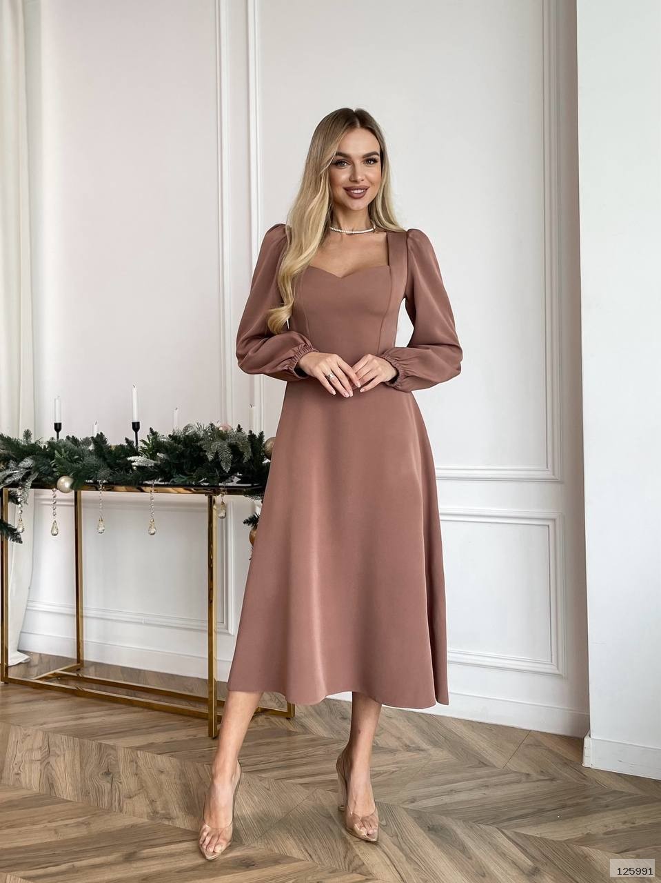Елегантна міді-сукня із ніжно приталеним силуетом та акцентованим вирізом-сердечком. Довгі об’ємні рукави додають жіночності, а тягнуча тканина забезпечує комфортне та ідеальне прилягання по фігурі. Сукня виглядає святково й водночас стримано — чудовий вибір для урочистостей, вечірок або святкових подій.