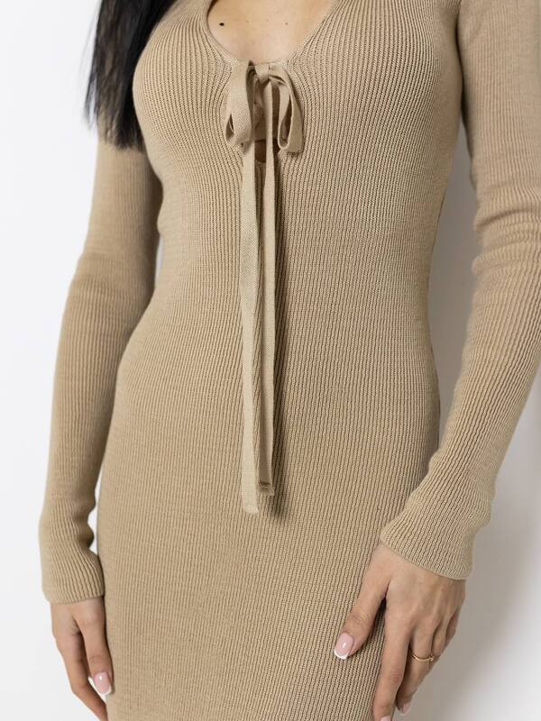 Сукня зі 100% бавовни із зав'язкою посередині привертає увагу своєю лаконічністю та вишуканими деталями. Зав'язка додає виразності і підкреслює зону декольте, створюючи елегантний акцент. Універсальний фасон дозволяє носити його як у повсякденному житті, так і на особливих заходах, легко поєднуючи улюблені аксесуари.