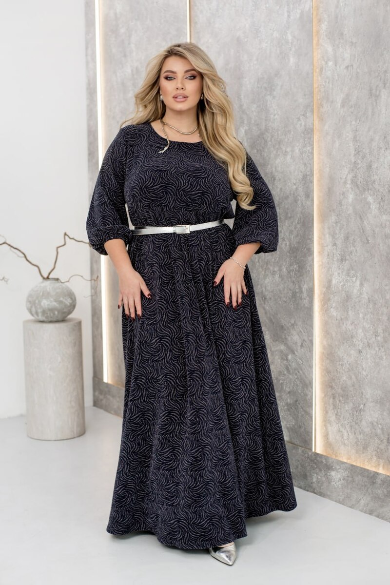 Довга сукня з мерехтливим дизайном — втілення ніжності, жіночності та святкової елегантності. Півкруглий виріз горловини та відрізна лінія талії підкреслюють фігуру, а спадаючі плісовані оборки додають легкості й витонченого руху. Рукави довжиною 3/4 з м’якими резинками на зап’ястках створюють об’єм і делікатний акцент. Вертикальні виточки формують красивий силует, а поясок із комплекту дозволяє обрамити талію, додаючи завершеності образу. Ця сукня м’яко виблискує при кожному русі — ідеальний вибір для особливих моментів, коли хочеться сяяти по-справжньому. Срібний пояс входить в комплект.