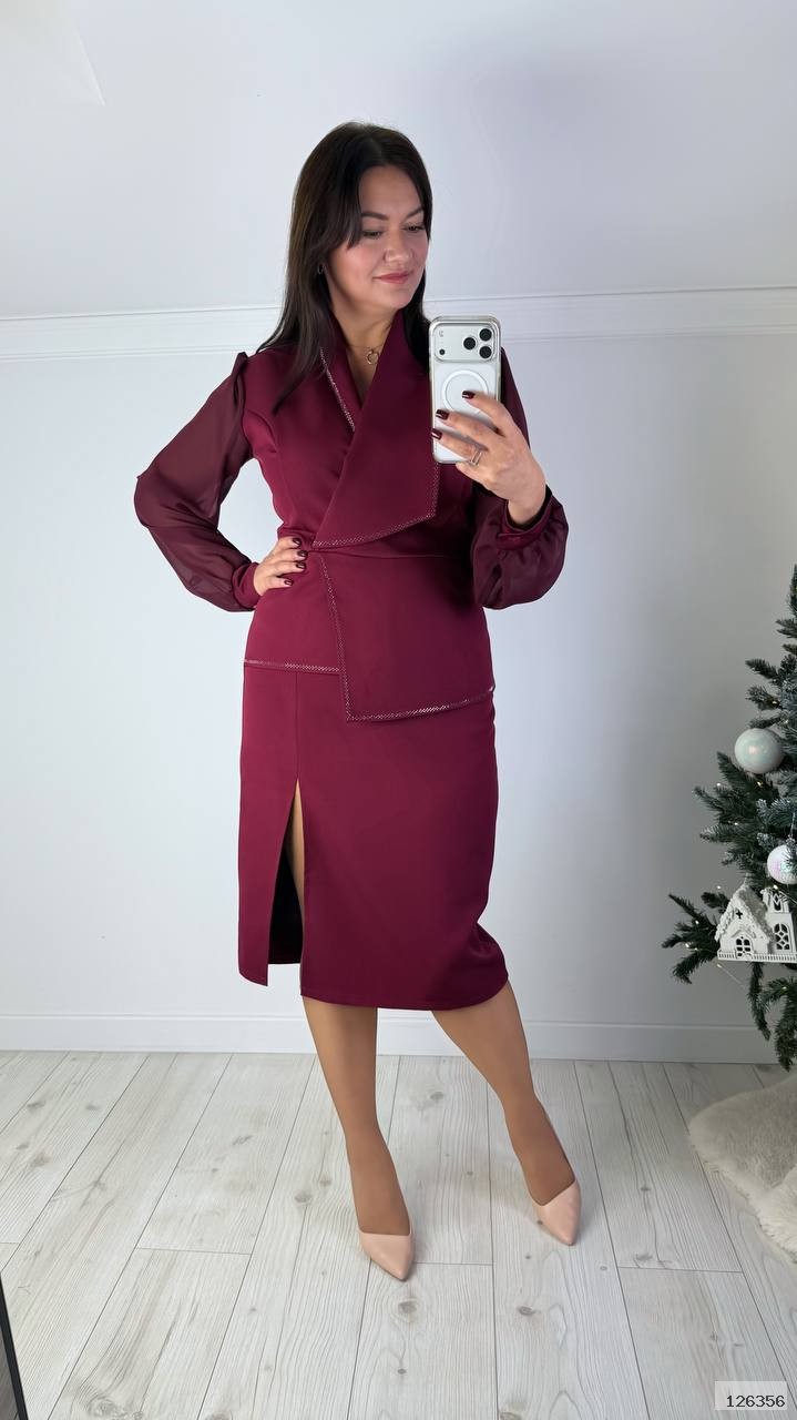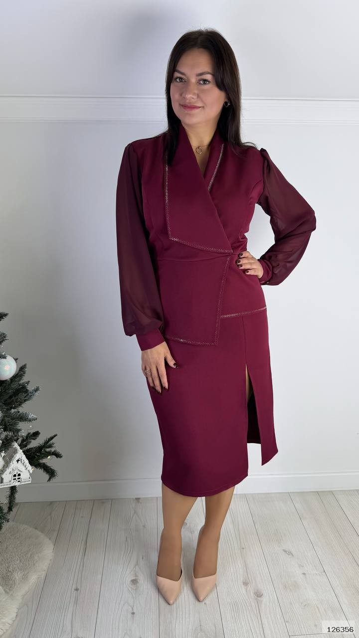 Шикарне нарядне плаття із баскою та розрізом попереду. Рукав довгий на ґудзику. Позаду потайна блискавка. Дуже гарно модулює фігуру та приховує недоліки