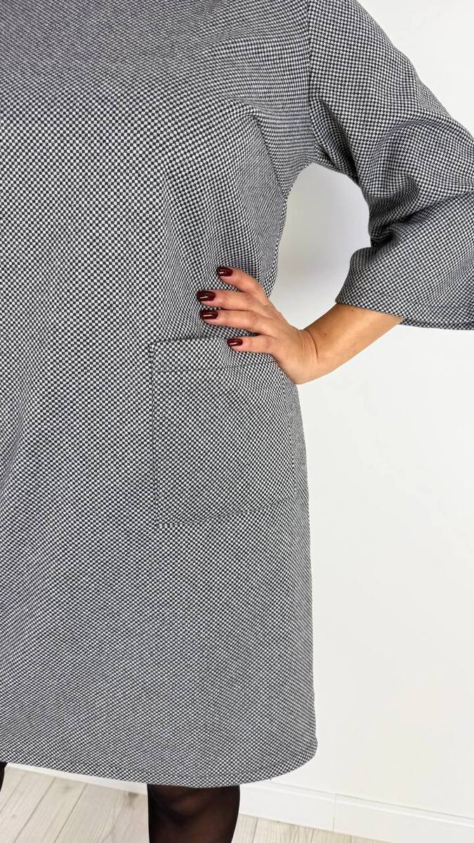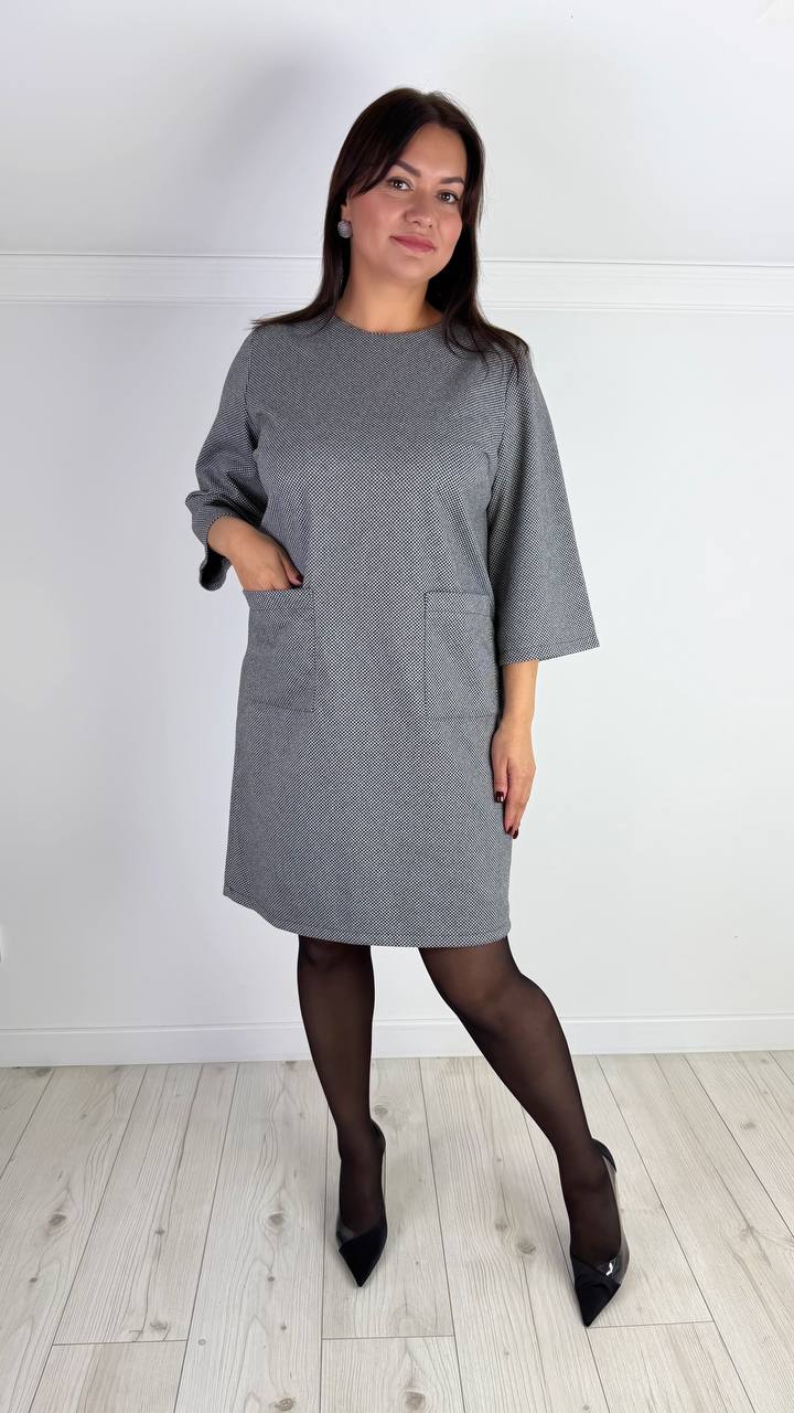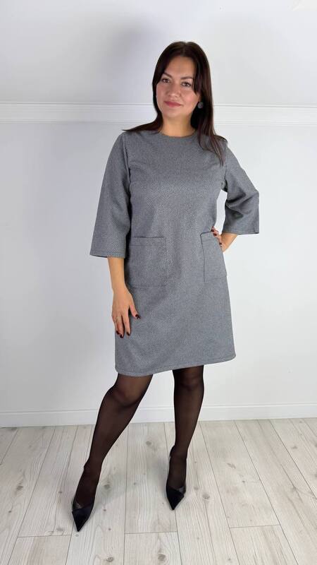 Плаття прямого крою,із накладними кишенями. Позаду потайна блискавка.